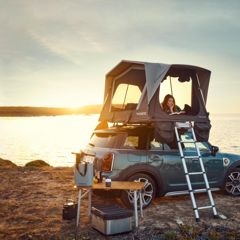 You don’t necessarily have to sleep in a tent on the ground or inside your vehicle when camping outdoors. You could always bring a rooftop tent so you can stretch out your legs and sleep in comfort. And if you have a compact vehicle then the Dometic TRT 140 AIR will work great.