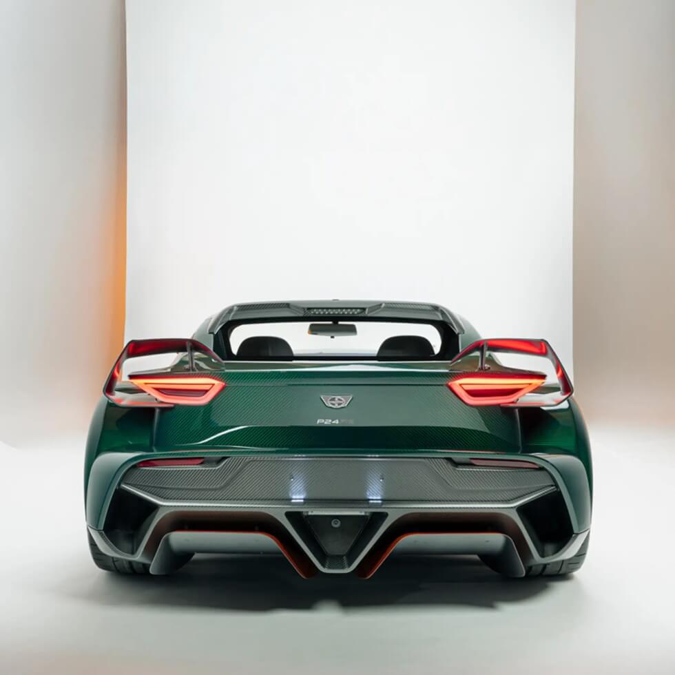 The P24 RS also features two butterfly doors and removable Ex-Core aero kits. Double wishbone suspension units and adaptive shock absorbers with electronic adjustments deliver a smooth and responsive driving experience. Unlike motorized mechanisms, the twin-targa carbon fiber roof needs to be manually attached and removed as needed.