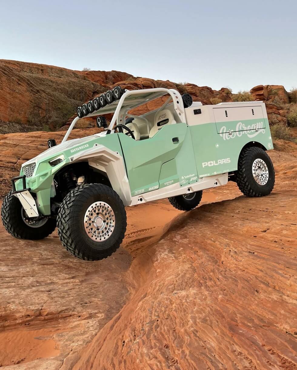 Technically, it’s a custom UTV that will haul your favorite frozen delights to where the action is. Events like off-roading competitions, music festivals, and so much more. Two Polaris generators power refrigerated coolers housed in special compartments at the rear.
