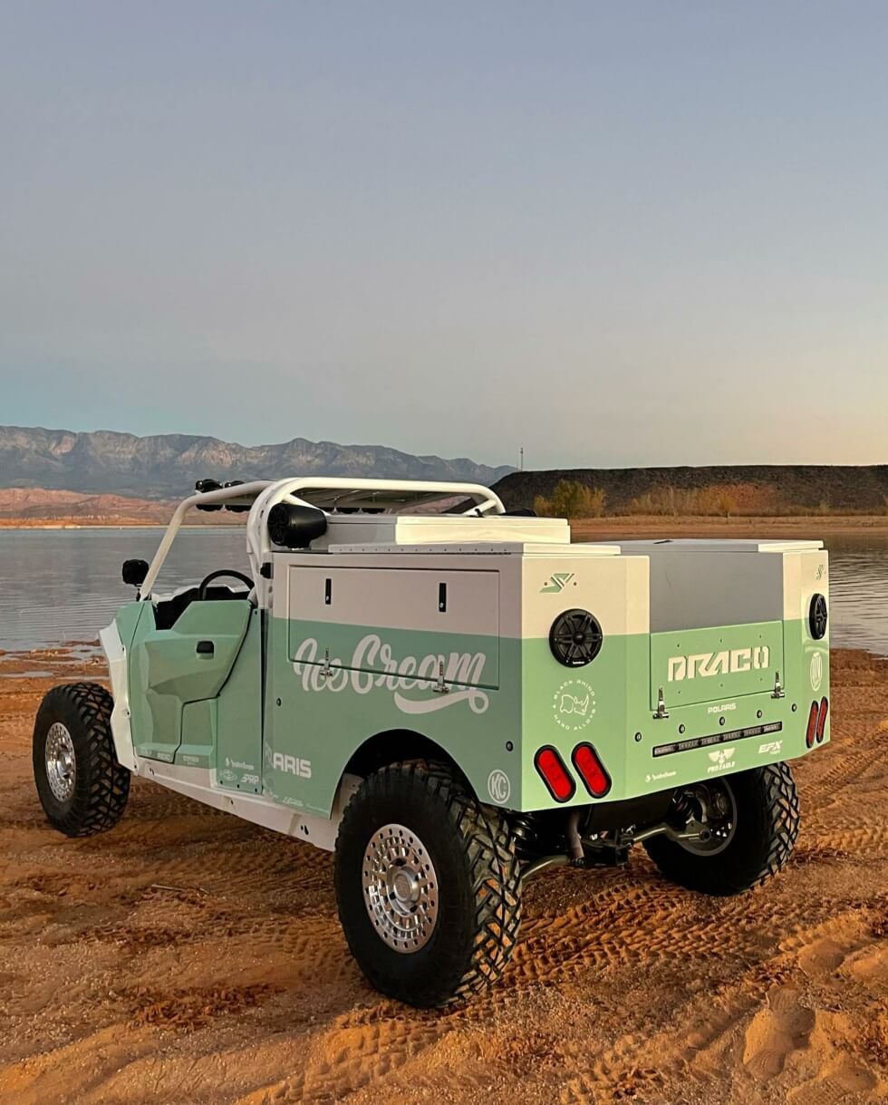 It’s just a wild guess, but maybe a bunch of crazy dudes from the two companies share the same thought too. They have our thanks as it is finally possible to purchase the delicious desserts almost anywhere with the help of a side-by-side built to do just that. Behold the Draco UTV x Polaris Ice Cream Truck.