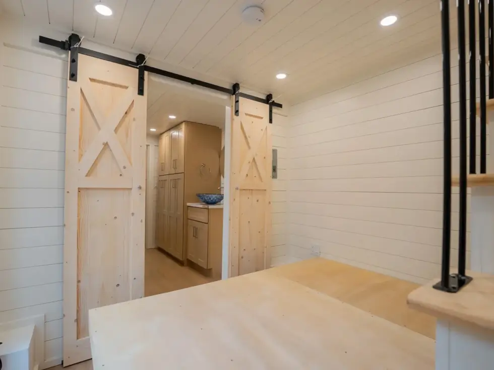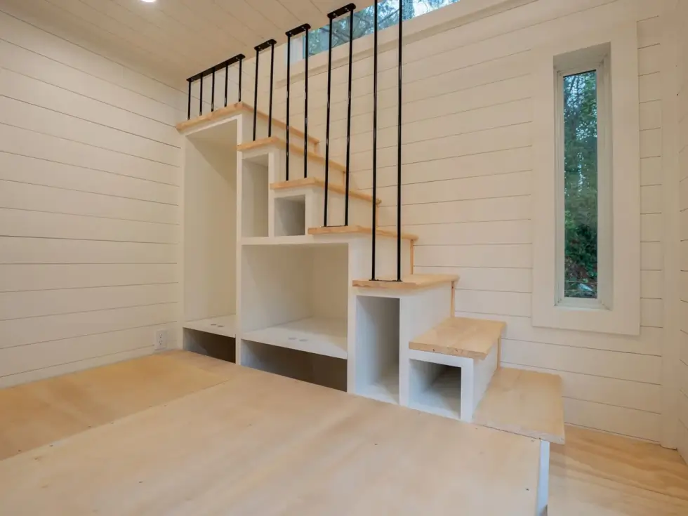 Dragon Tiny Homes designed this area with a modern, contemporary look. It has a high ceiling with a ceiling fan providing enough ventilation, although the house has a split-type AC. Then, opposite the living room is the loft bedroom, accessible from the bathroom/utility room. It offers enough headroom for standing up. From the bedroom is a storage-built-in staircase that leads to the loft area, which serves as a storage room or extra bedroom.