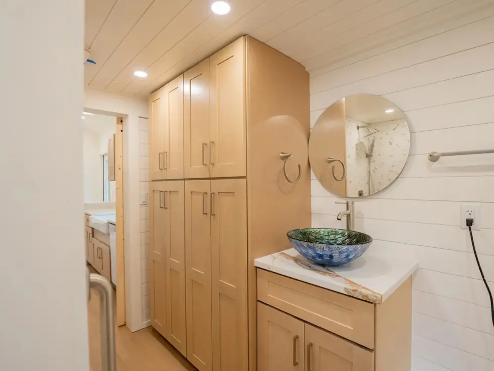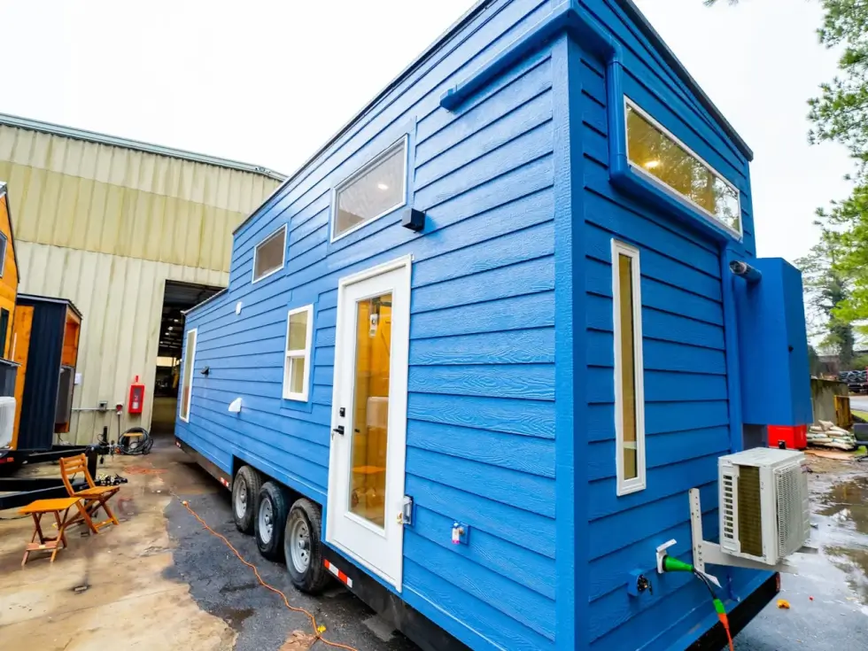 Built on a triple-axle trailer, this home demands attention inside and out. The exterior reminds you of a tropical hideaway with engineered wood cladding finished in white and blue. The design includes two separate entrances.