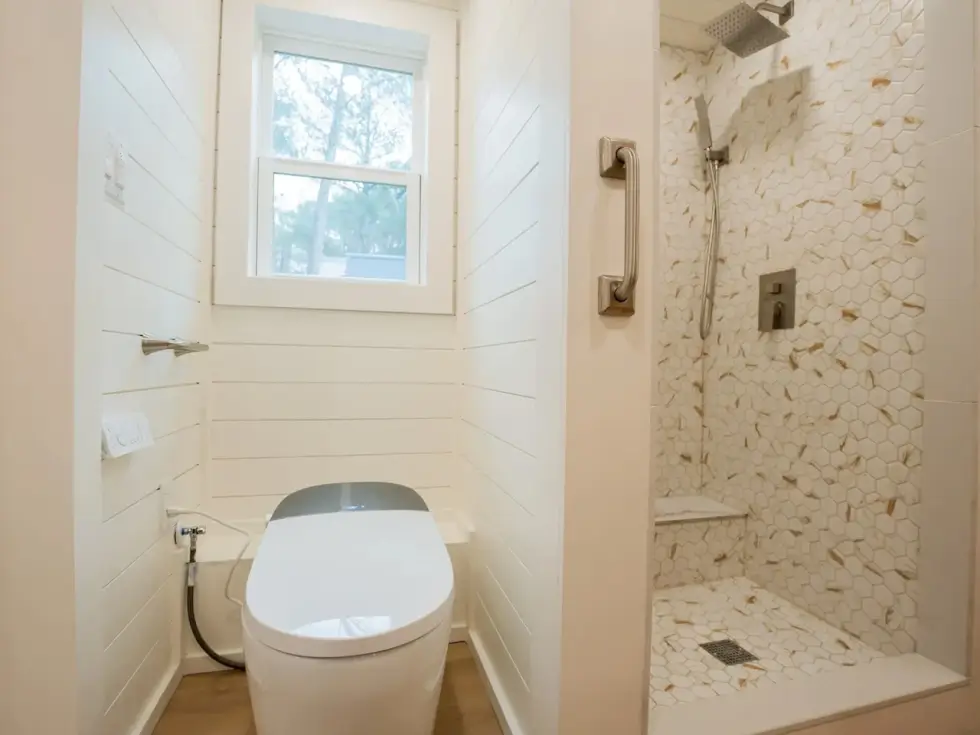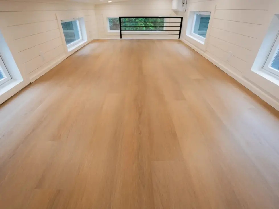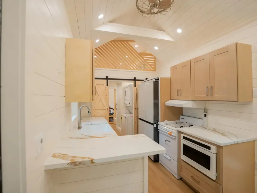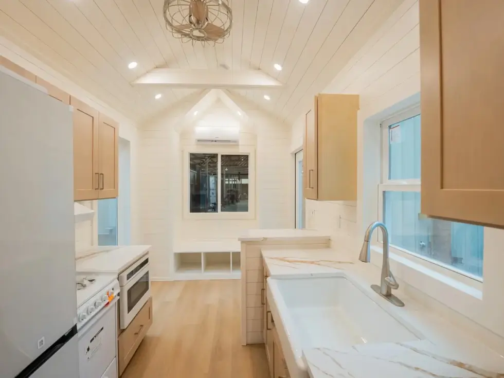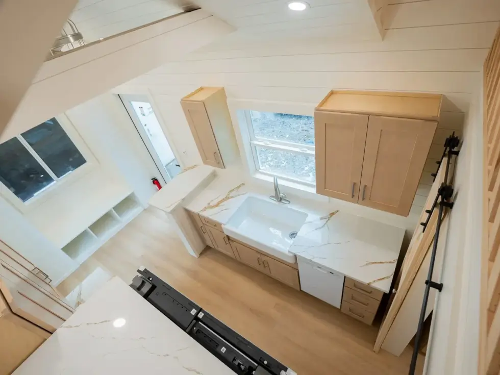 This yet unnamed tiny home model from Dragon Tiny Homes boasts an elegant interior layout designed for long-term living. It feels airy and spacious despite measuring just 32 feet long and packed with all the modern comforts.
