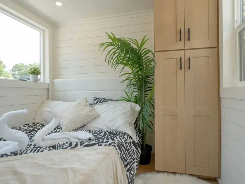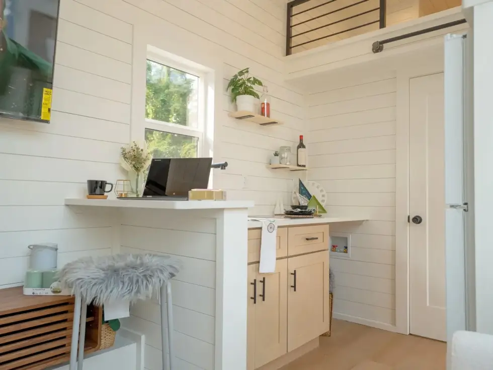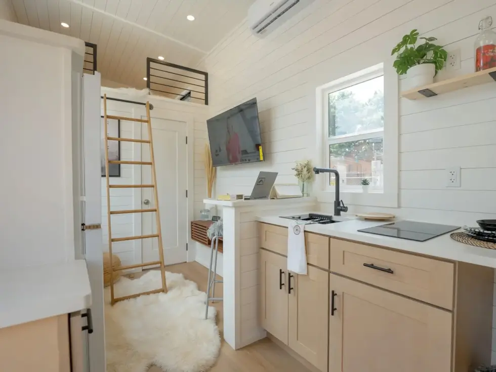 Inside, the house feels open and welcoming despite its small footprint thanks to its wood finish and clean lines. Every nook is maximized for storage yet the home doesn’t feel cramped. The TV-ready living area flows seamlessly into a modern kitchen equipped with full-size appliances. There’s also a surprising amount of counterspace for all the food prep, cooking, and dining, as well as lots of cabinetry for storage.