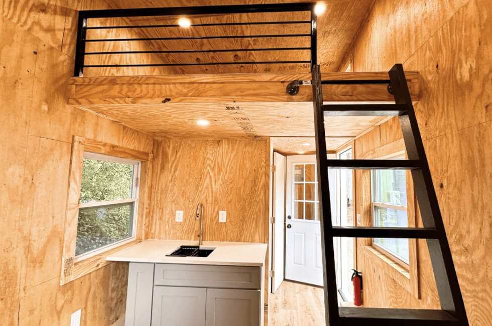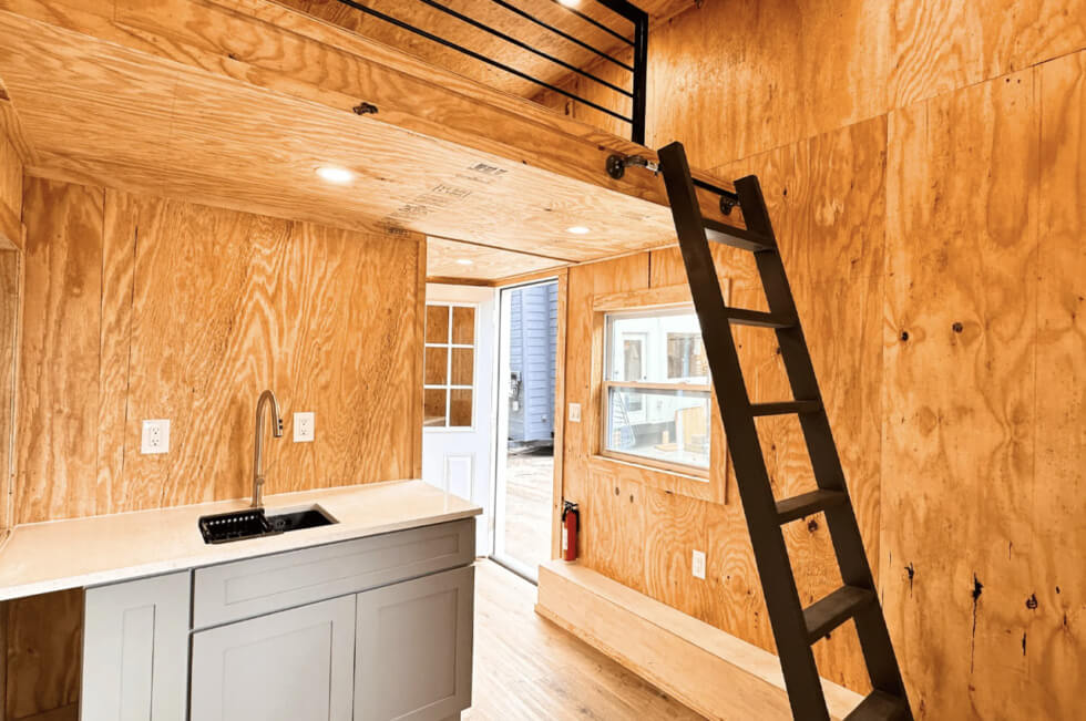 Meanwhile, a ladder leads to the roomy loft, which can serve as a living room or sleeping area. This tiny home offers several operable glass windows to invite natural light and ventilation, and also open the interior space to the outdoors, to make it feel cozy and spacious.