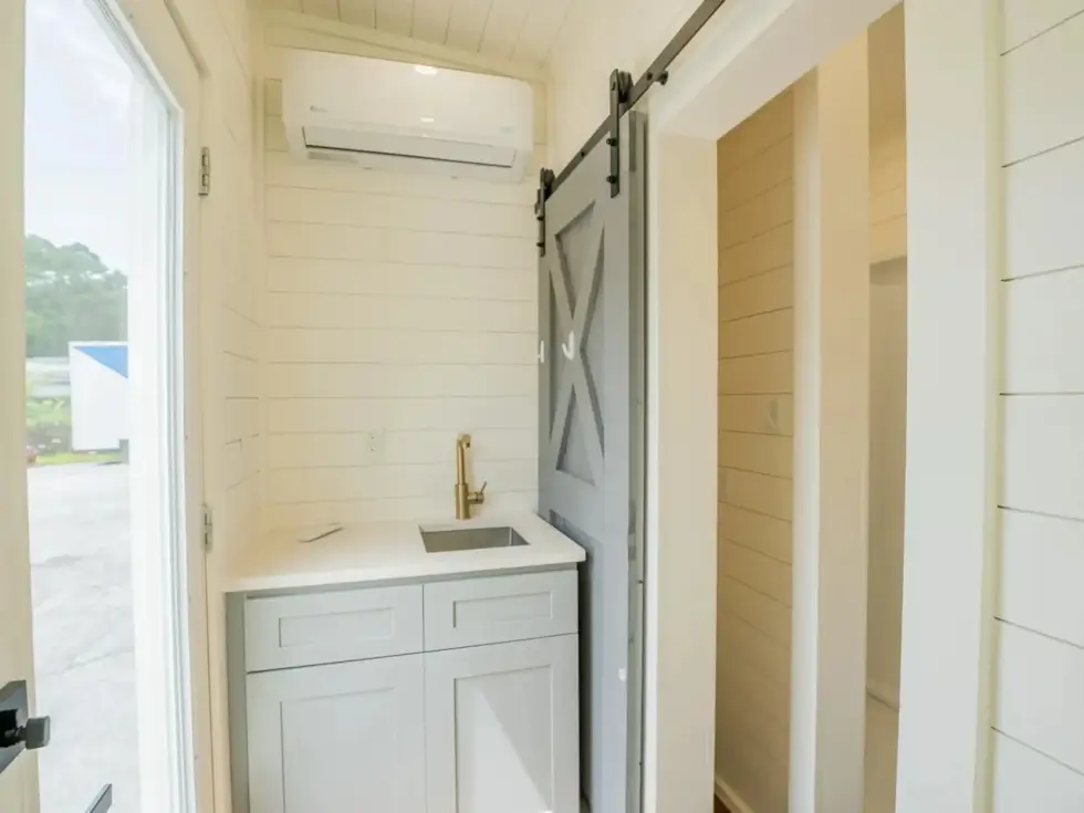 The Fairfax tiny house features a robust steel frame with cement board siding for durability. The entrance leads directly to the kitchenette equipped with a stainless steel sink, quartz countertop, and ample cabinetry for storage.