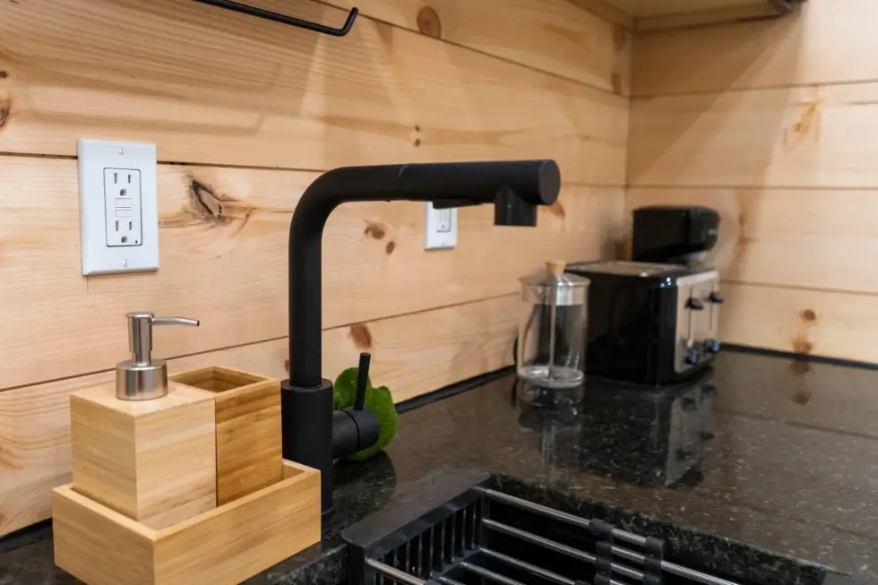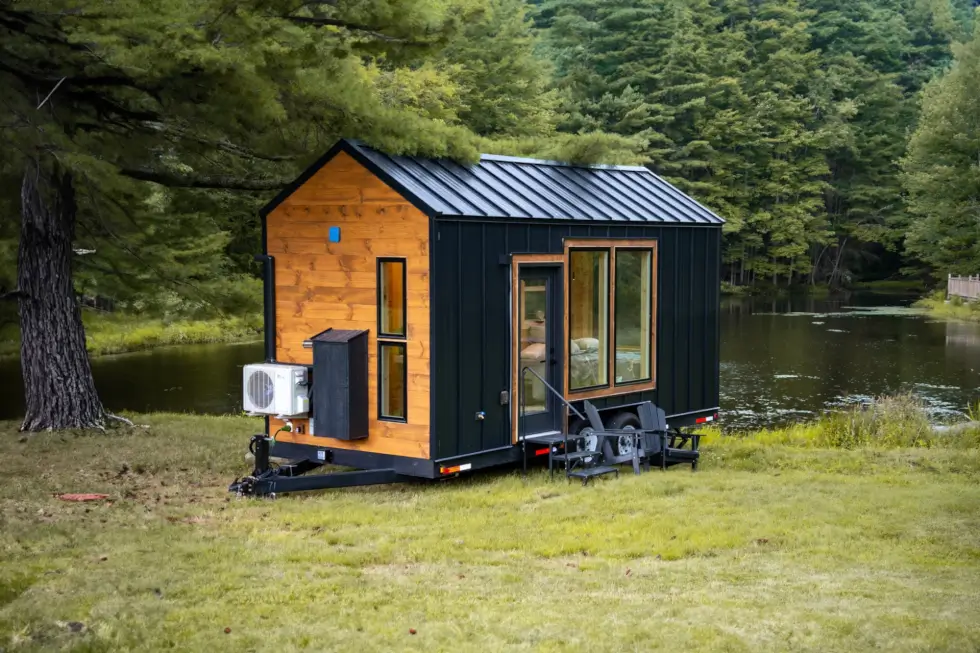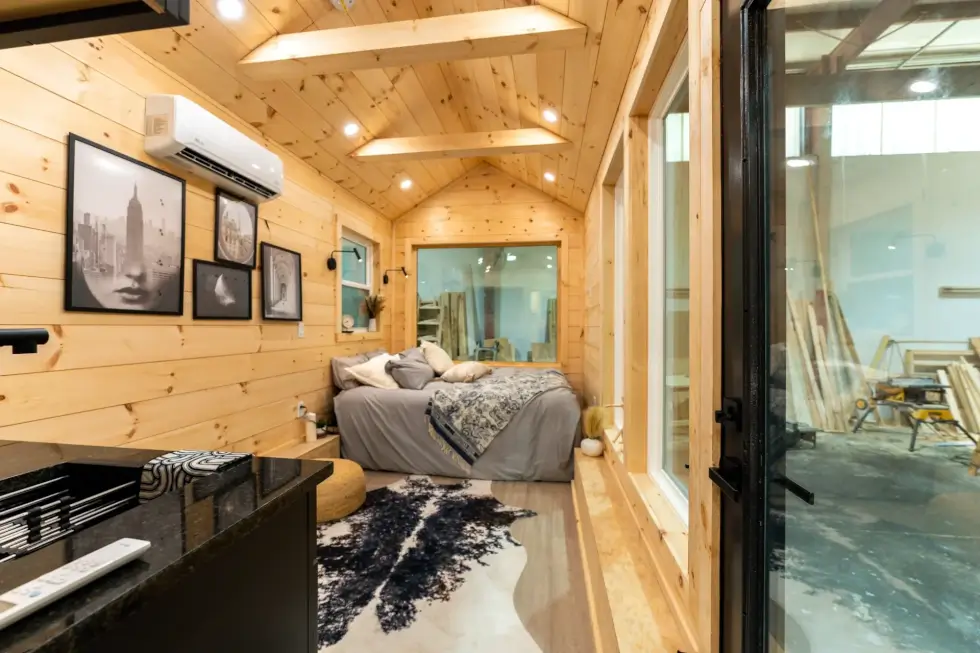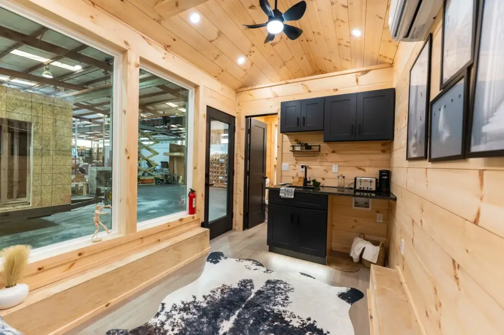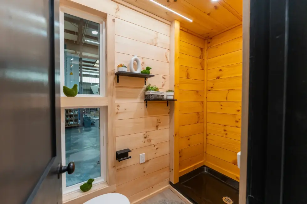 Meanwhile, the bathroom is surprisingly generous or spacious for a home of this size. It has a 48″ shower, a flushing toilet, and a compact wall-mounted sink. Black accents throughout give the area a cohesive look. Meanwhile, a mini split HVAC system and a ceiling fan ensures comfort.