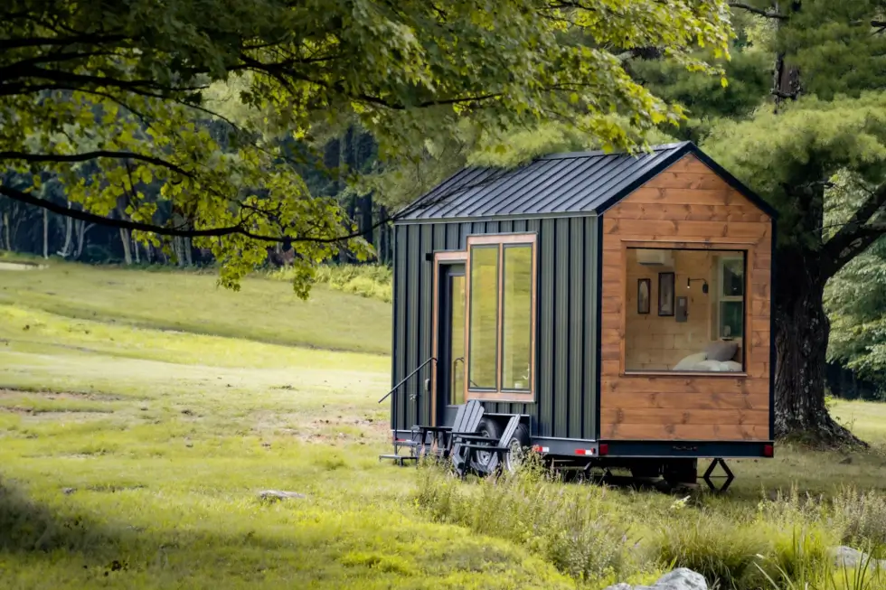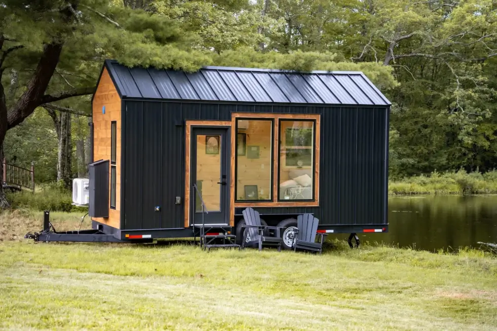 The design blends modern functionality and Scandinavian warmth. It features sleek black standing seam metal siding and natural wood accents for a minimalist aesthetic. Glass doors open to a cozy and functional open-plan layout with each space cleverly maximized for use.