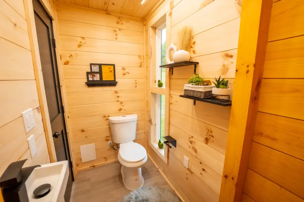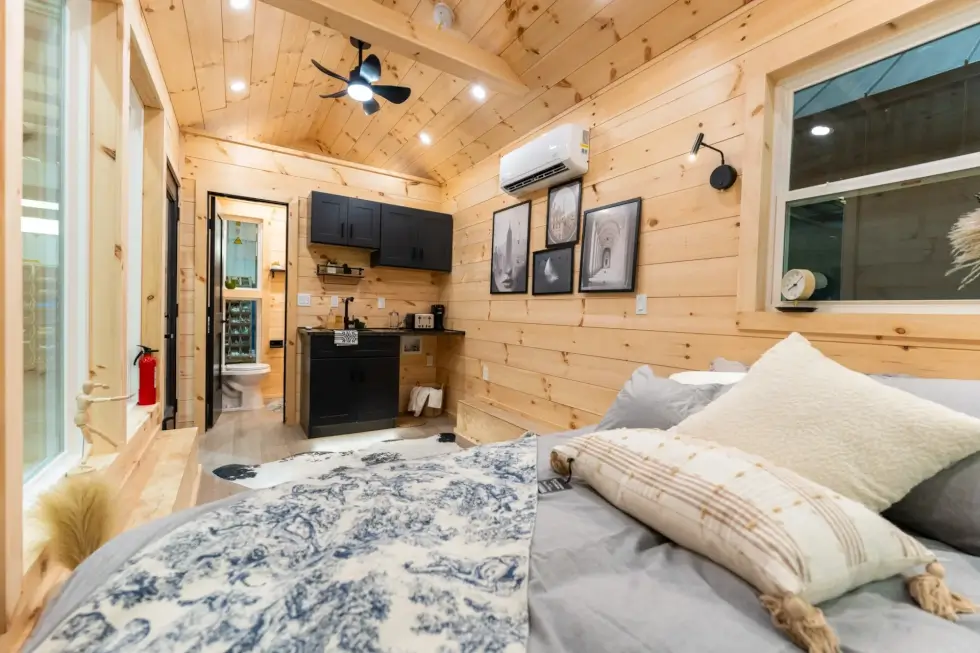 Kemi opens to a wood-lined interior built with locally sourced Georgia pine. Then picture windows add a modern edge and makes the tiny space feel spacious. They invite natural light and allow seamless indoor and outdoor integration. A queen-size bed can fit alongside one massive window for a cozy sleeping nook. There’s also another window at the front, ensuring a bask of sunlight to the interior.