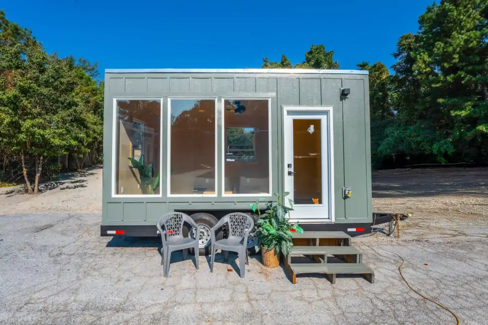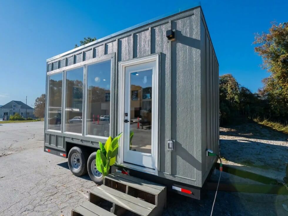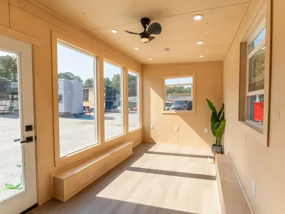 THOW features engineered wood cladding decked with floor-to-ceiling glazing. Using expansive glass windows is a strategic choice, one that benefits the interior. The windows open up the space to natural light to make it feel bright and spacious as it connects indoors and outdoors.