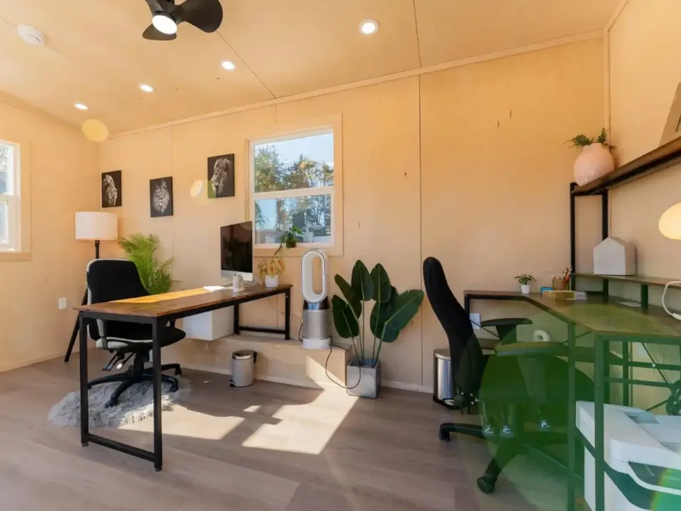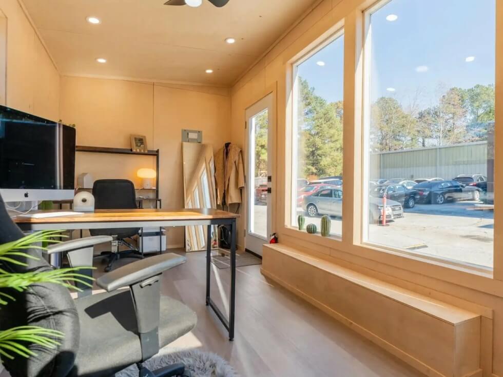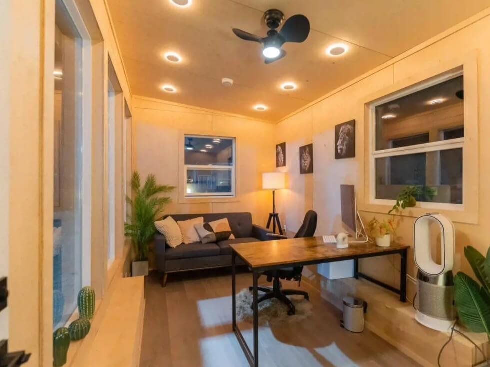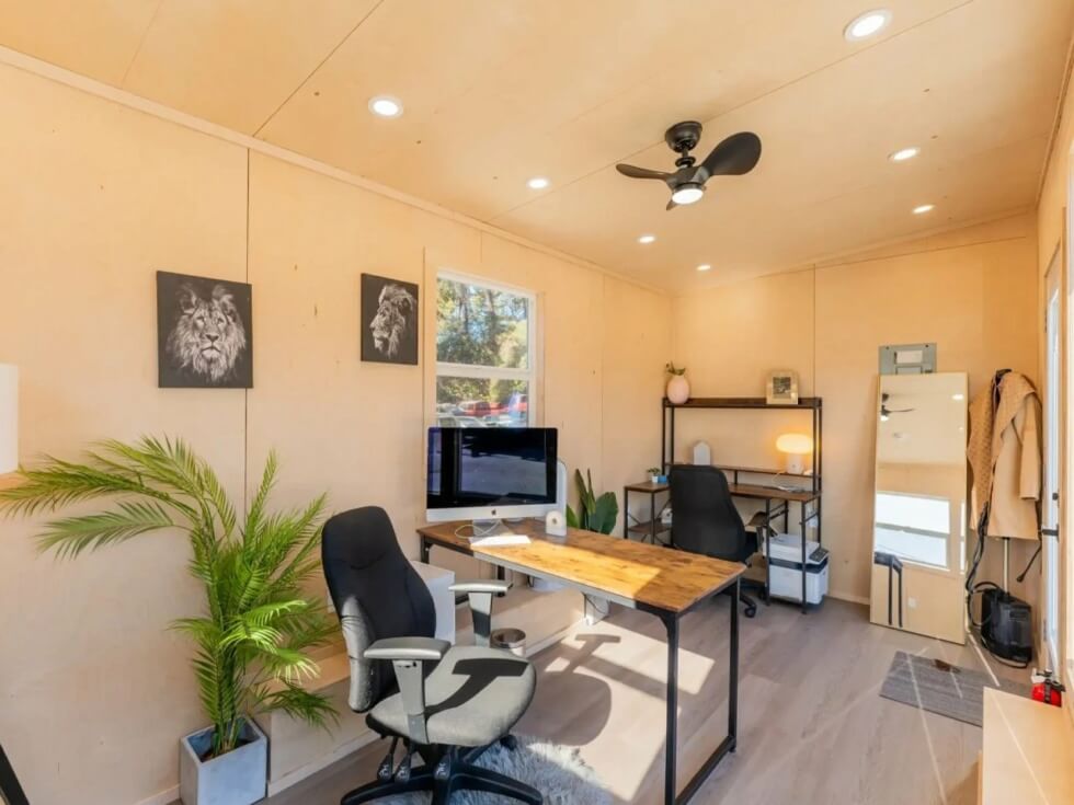Meanwhile, a single-glazed door leads to an interior layout that prioritizes function over divisions. It has a modern, professional design and renders show the Birch wood-panelled space can accommodate a couple of desk stations and a small sofa propped against the wall. It also has a storage unit, a ceiling fan and AC unit for ventilation and LED lights run the length of the ceiling.