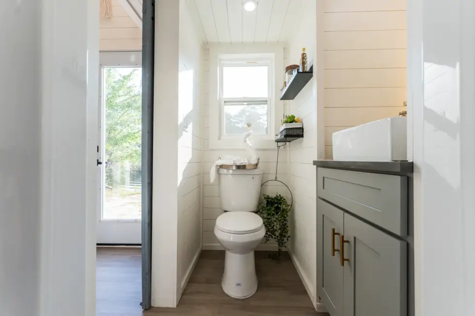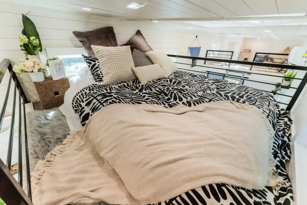 This space has a queen-sized bed and opens to natural light via glass windows. It also overlooks the second loft bed on the opposite end of the home. A ladder leads to the second loft bed. Under it is the bathroom equipped with a flashing toilet and shower and closes for privacy via a barn door.
