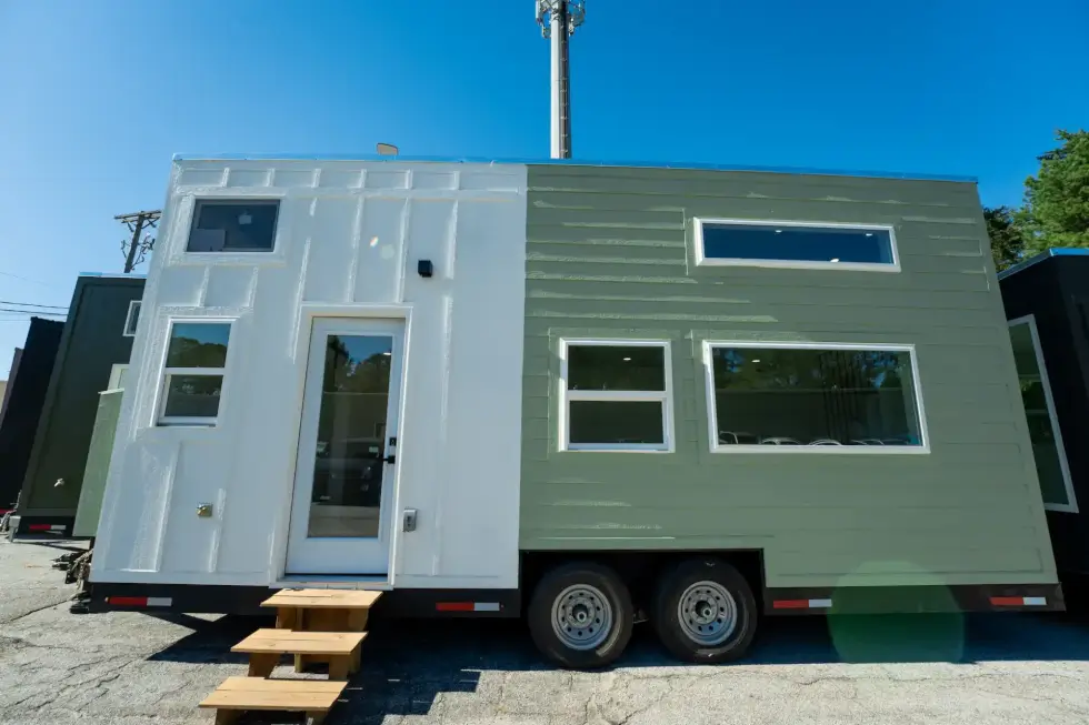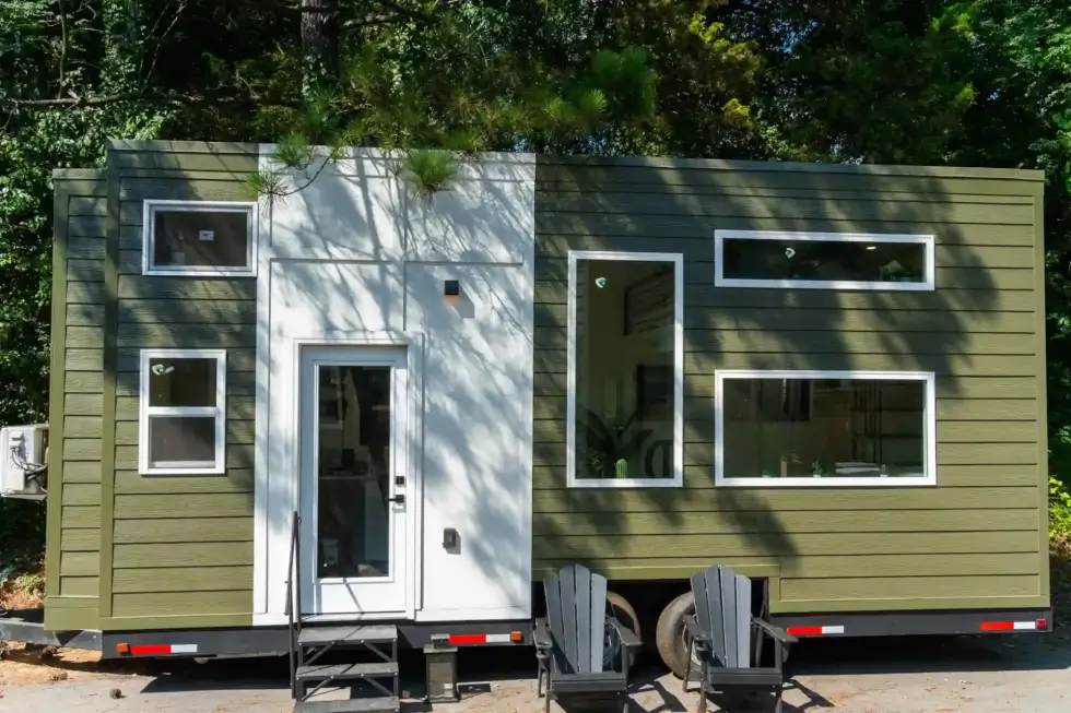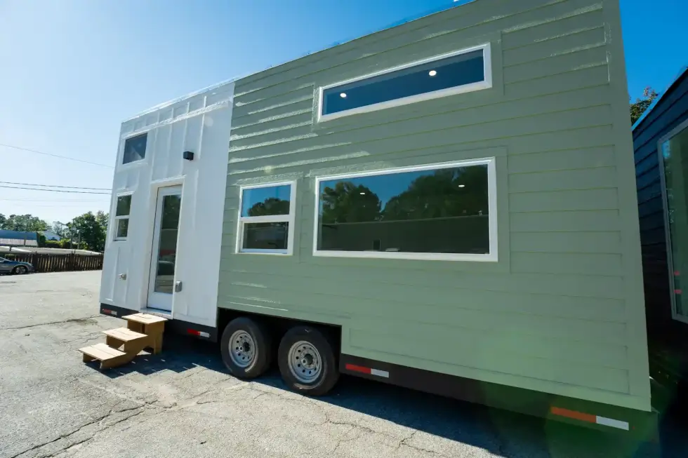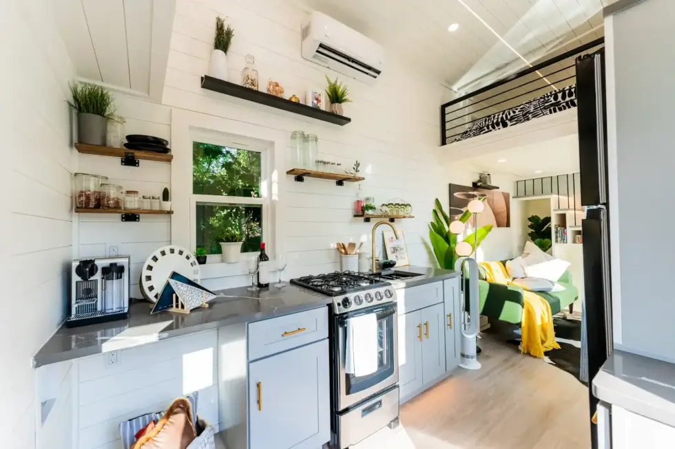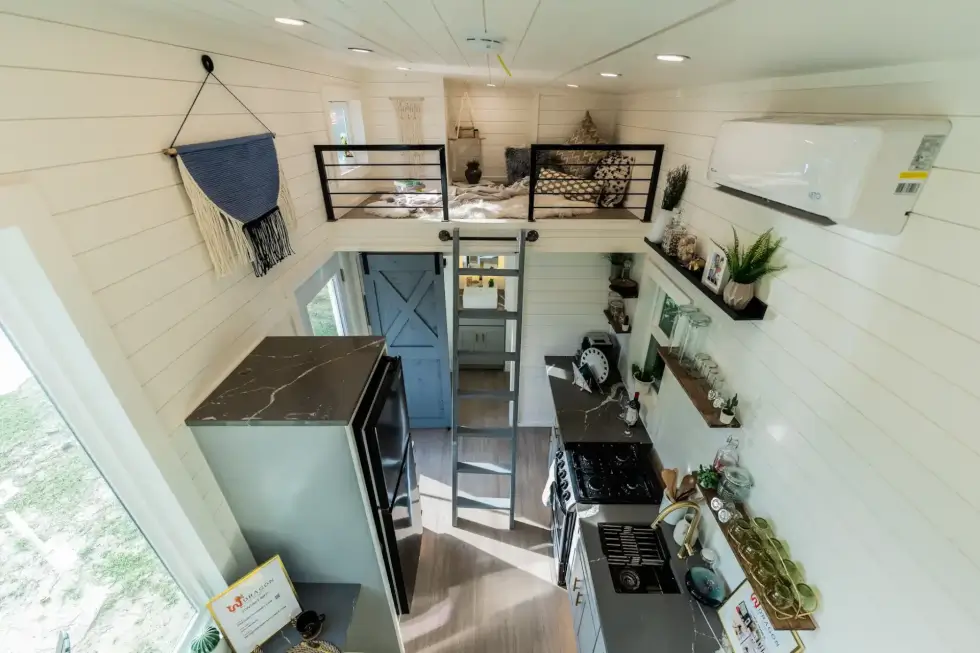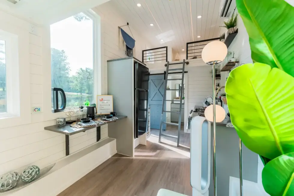 The Vista tiny house looks modern with LED trims placed underneath the stairs and then up over the full house. It offers a spacious and comfortable living experience, measuring 24′ x 8.5′ x 13.5′, with 6′ wide windows for panoramic views.