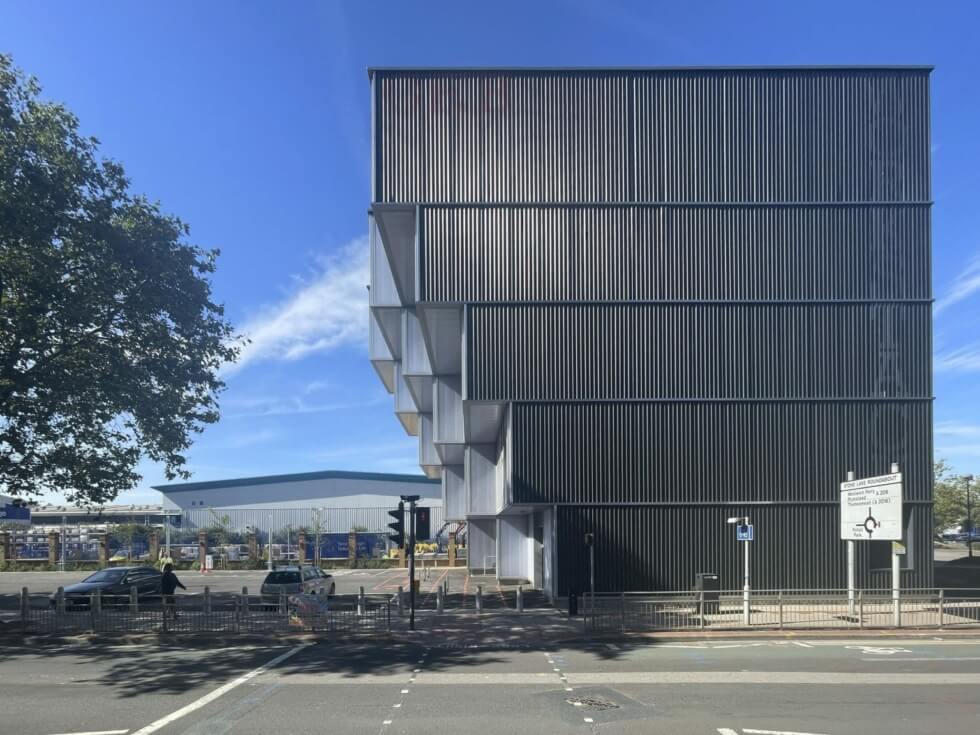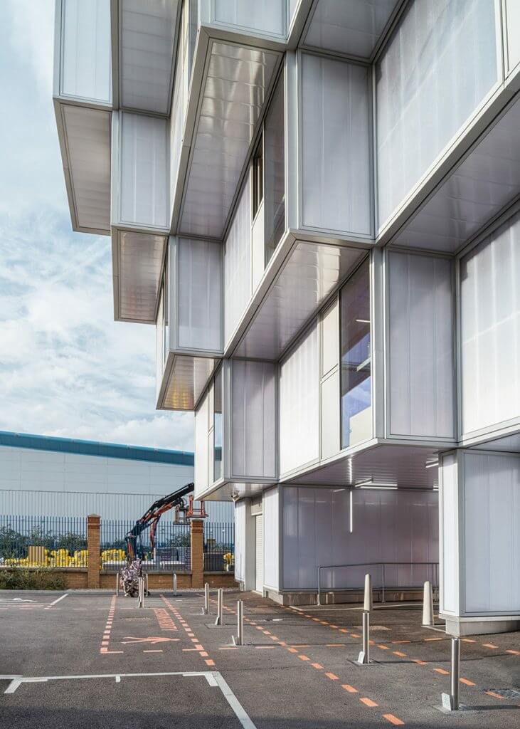 The building features a stepped form that’s designed to accommodate 14 units with its top-heavy design doubling as cover for a central loading bay. Each unit serves as a workspace for approximately 60 people and it faces out towards the car park through full-height windows and panels of translucent polycarbonate.