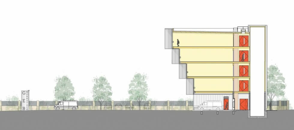 Its current occupants, including a motorcycle shop, knitwear producers, and furniture makers, have access to the building via lifts and a staircase located at the rear alongside a plant room. dRMM said the structure “equates to a density of roughly 428 employees per hectare, compared to the London industrial average of 69 employees per hectare.”