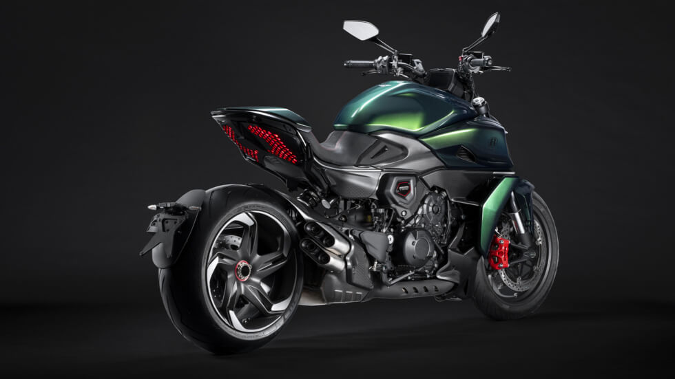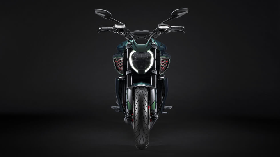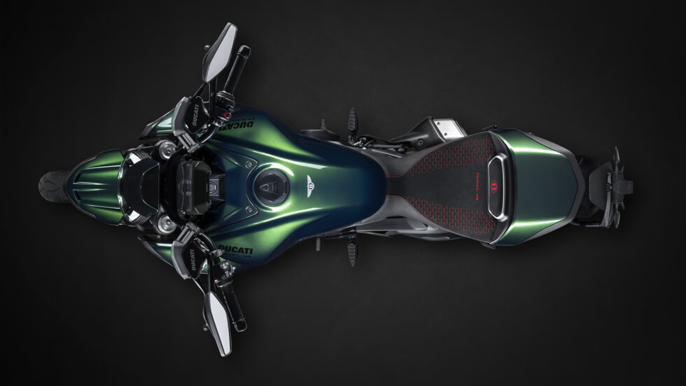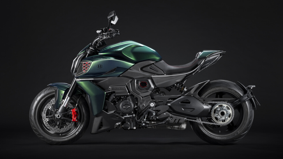 Prominent cosmetic resemblances to the vehicle in question include the side air intakes and the forged rims shod in Pirelli Diablo Rosso III tires. Carbon fiber body panels, red Brembo brake calipers, and red fabric on the Alcantara saddle contrast the metallic green paint job of the Diavel for Bentley. Only 500 examples are due for production.