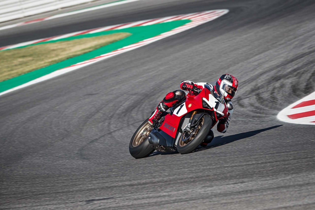Underneath the new Panigale is a handful of special parts. Among them are an Akrapovic exhaust, a dry clutch conversion, and a Panigale V4 R front frame. You’ll also find forged magnesium wheels care of Marchesini here. Not to mention other bits and bobs straight out of the Ducati Performance catalog.