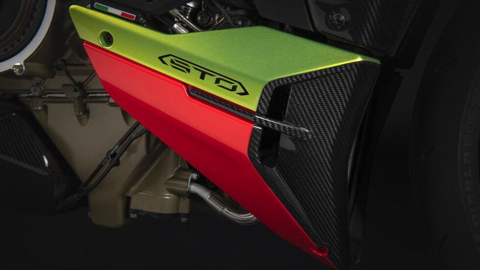 Their previous partnership was a motorcycle tribute to the elusive supercar hybrid Sián FKP 37. Now we have another striking silhouette with elements based on the Huracán STO (Super Trofeo homologated). The base model for this build is a Panigale V4 S ’23 which is a track-ready beast.