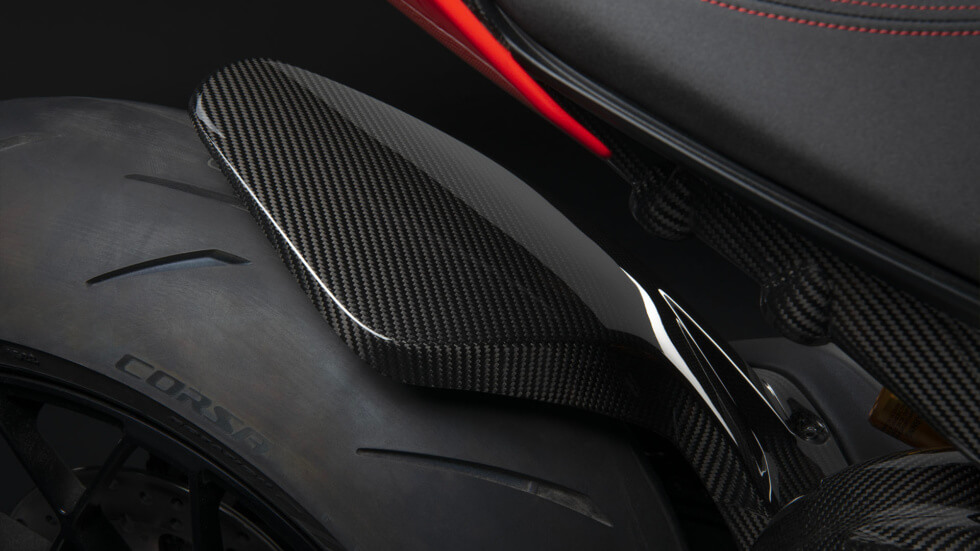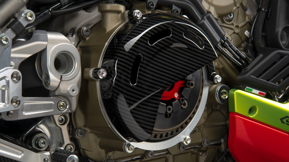To keep the Streetfighter V4 Lamborghini stable at high speeds, carbon fiber wings line the sides of the tank. You can also see the composite adorn various sections and parts of the superbike. Other aspects it draws from the Huracán STO are the front mudguards, saddle, and rims.