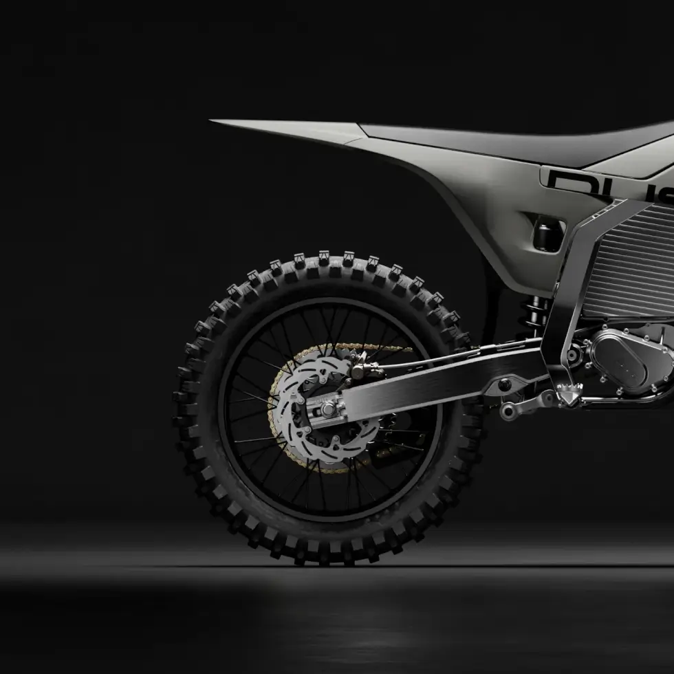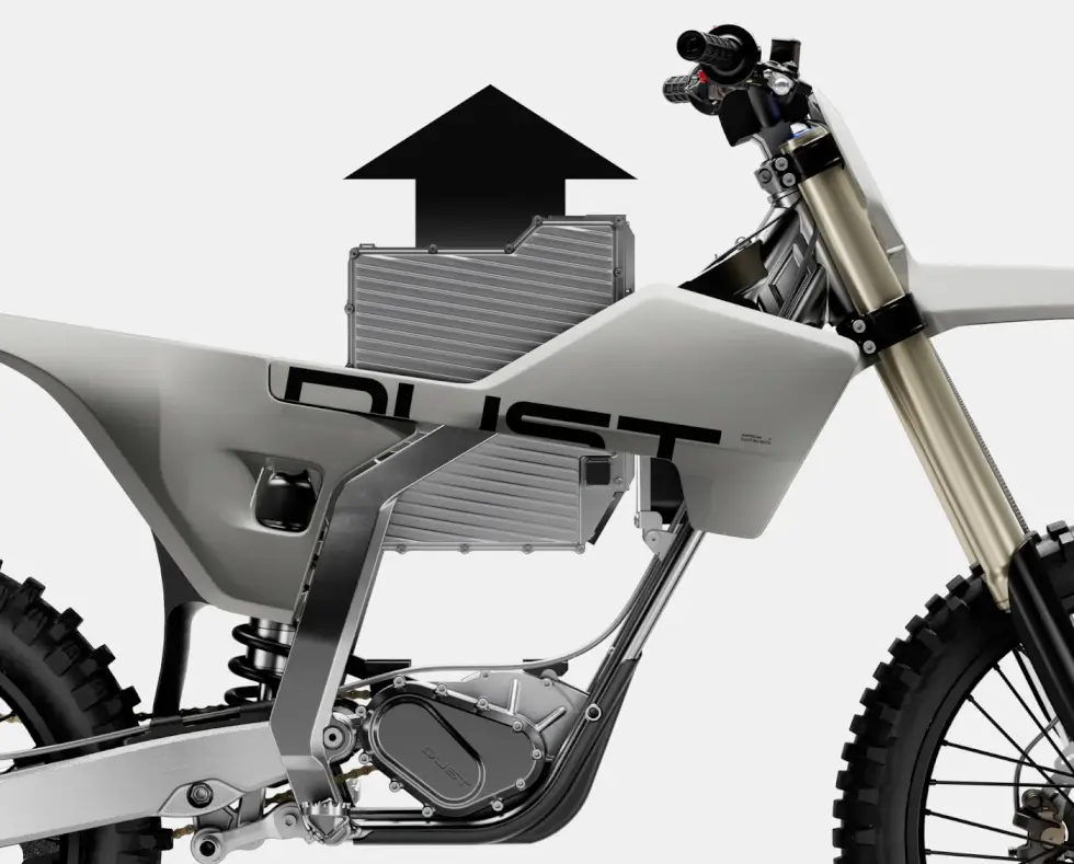 Dust Moto outfits the Hightail with a motorsport-grade electric drive and gearbox. Energy is supplied by a removable 4.4 kWh, 80V, and 500A rechargeable battery. Peak power is around 32 kW or 42 horsepower, while torque is approximately 44 lb-ft. To access or swap it out, the saddle needs to come off.