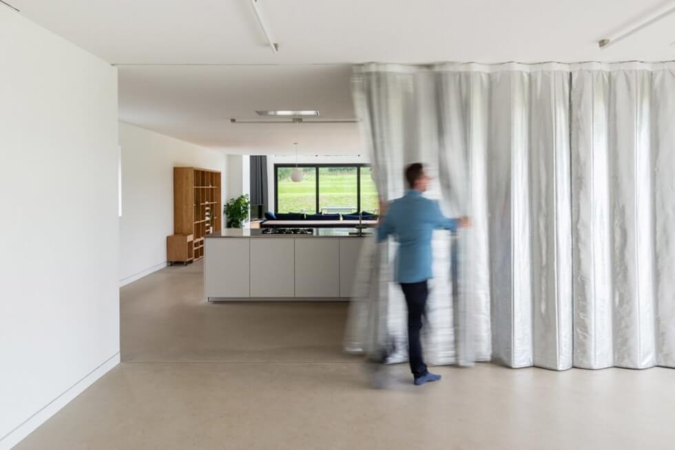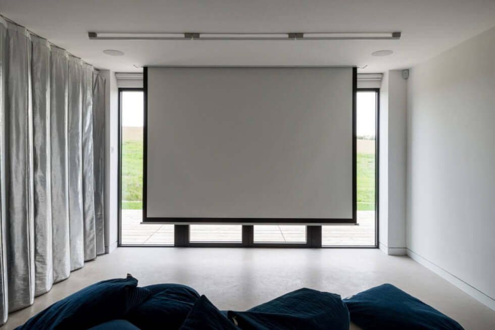 Meanwhile, sliding glass doors and windows provide amazing views of the surrounding lush greenery. A screen projector and a smart TV provides modes of entertainment along with games, books, and Wi-Fi. A grey wool curtain on the ground floor creates a partition for multi-purpose use and automated blinds provide privacy.