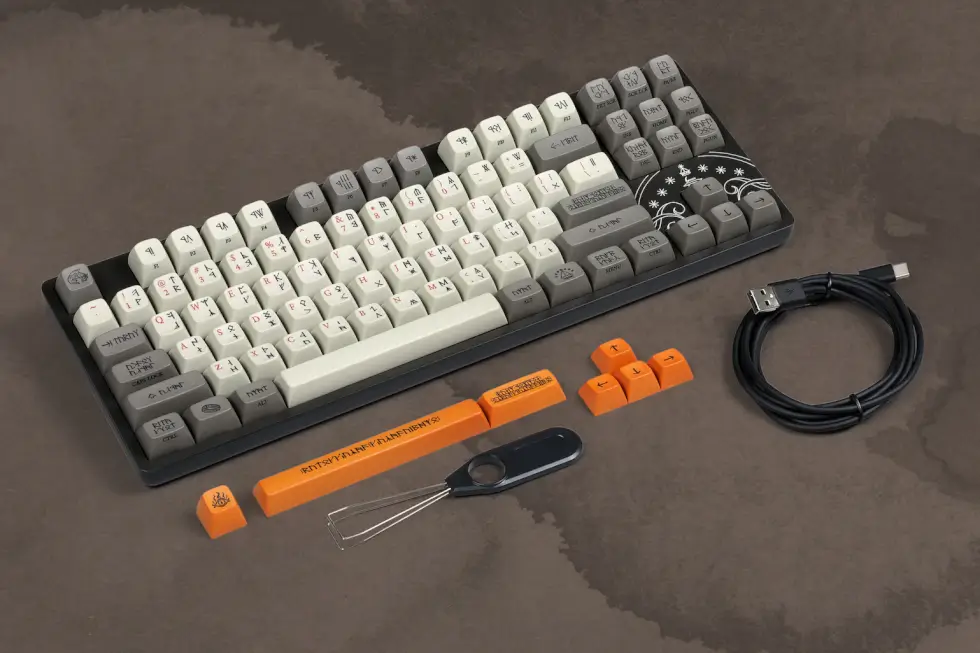 White backlighting highlights the Cirth and Khuzdul characters of the keycaps. Moreover, an artwork of the Doors of Durin by OSHETART adorns the space just above the arrow keys. In the box is the Dwarvish keyboard, a keycap puller, and a USB-A to USB-C cable.