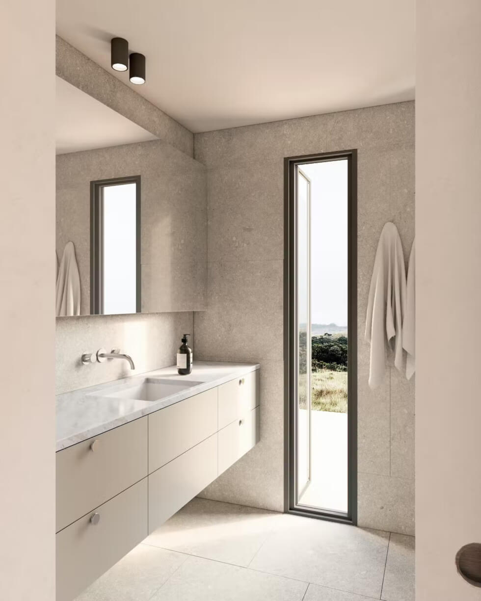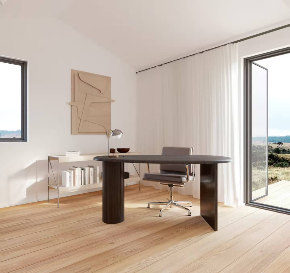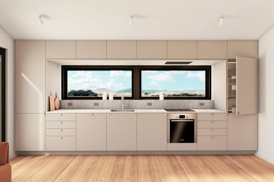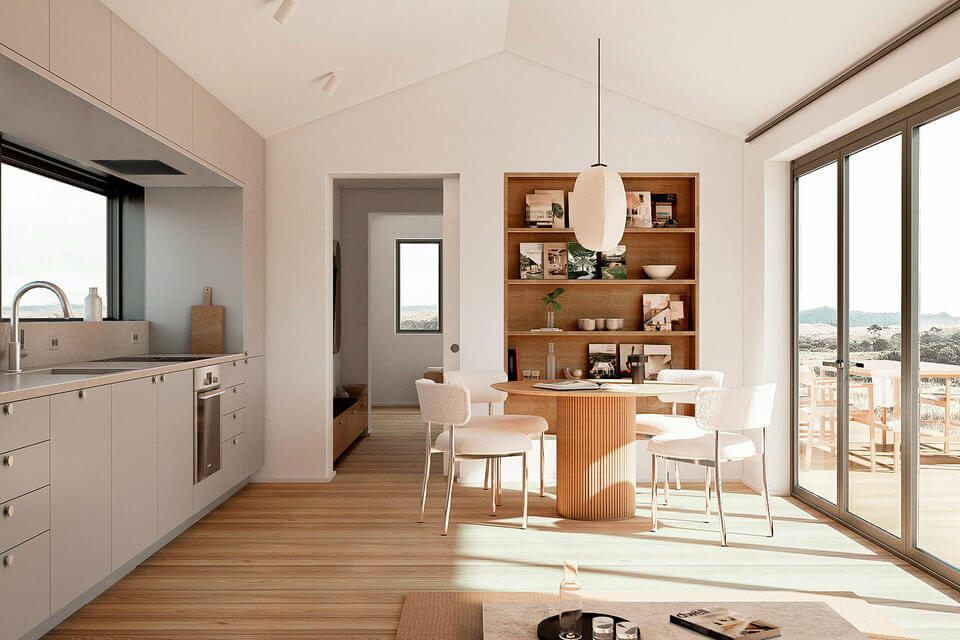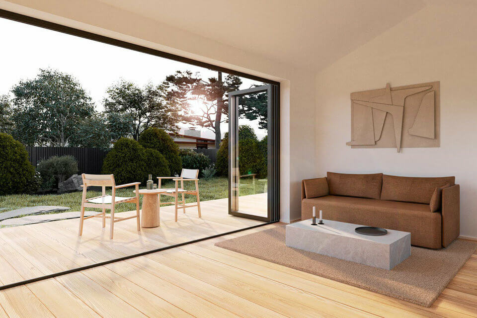 Likewise, the house features charred timber flooring, oak joinery, and stone countertops in the kitchen and bathroom. This ADU was designed for versatility. One of its great features is the large folding glass wall in the living room by NanaWall. It seamlessly connects indoor and outdoor spaces. It allows the breeze to come in through to the kitchen window and provides uninterrupted views of the outside scenery.