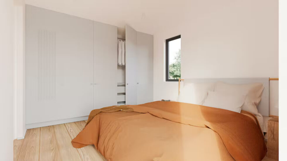 This is a sleek 540-square-foot house with a bedroom, a bathroom, a shoe cabinet, and a kitchen built into the living-dining space equipped with appliances from Bosch. These include an oven and kitchen range, a refrigerator, and a dishwasher. It has tons of built-in storage spaces and a ducted mini-split for climate control.