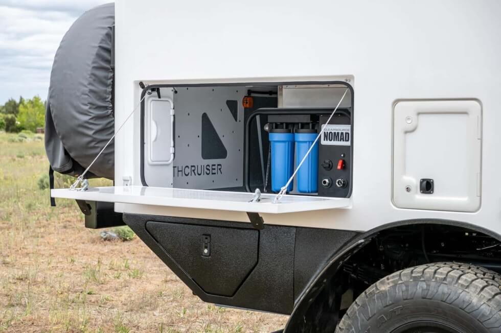 As such, the EarthCruiser Terranova offers both from the inside and outside, including cooktop and sink-top storage. There are even under-bed storage cubbies and a kitchen pantry. What makes this offroad vehicle great is that it is customizable so you can modify tire choice and suspension for the best personalized serviceable domestic chassis.