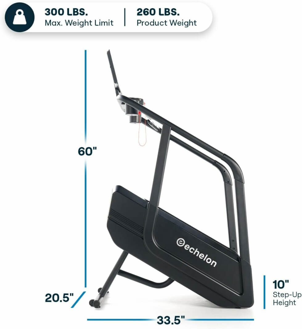The Echelon Summit Stairmill offers adjustable 38° incline for challenging yet effective workouts. It also has adjustable pace (14-140 steps per minute) for either low-impact or intense workout. Its Bluetooth-connected 22″ LCD console tracks your progress and the handlebars have heart rate sensors that syncs with a Bluetooth heart rate monitor for real-time feedback. It shows the steps taken per minute, heart rate, calories burned, and more.