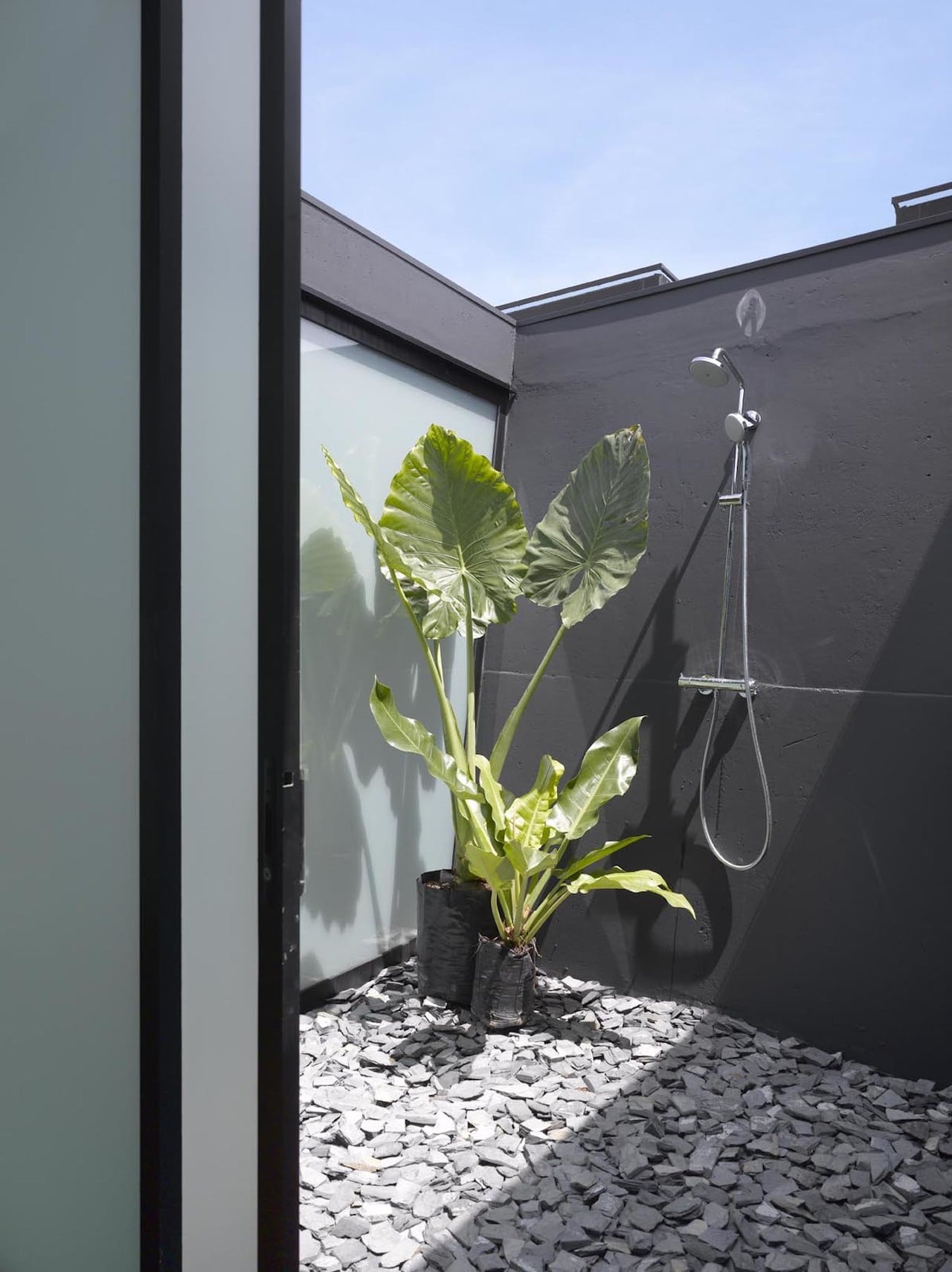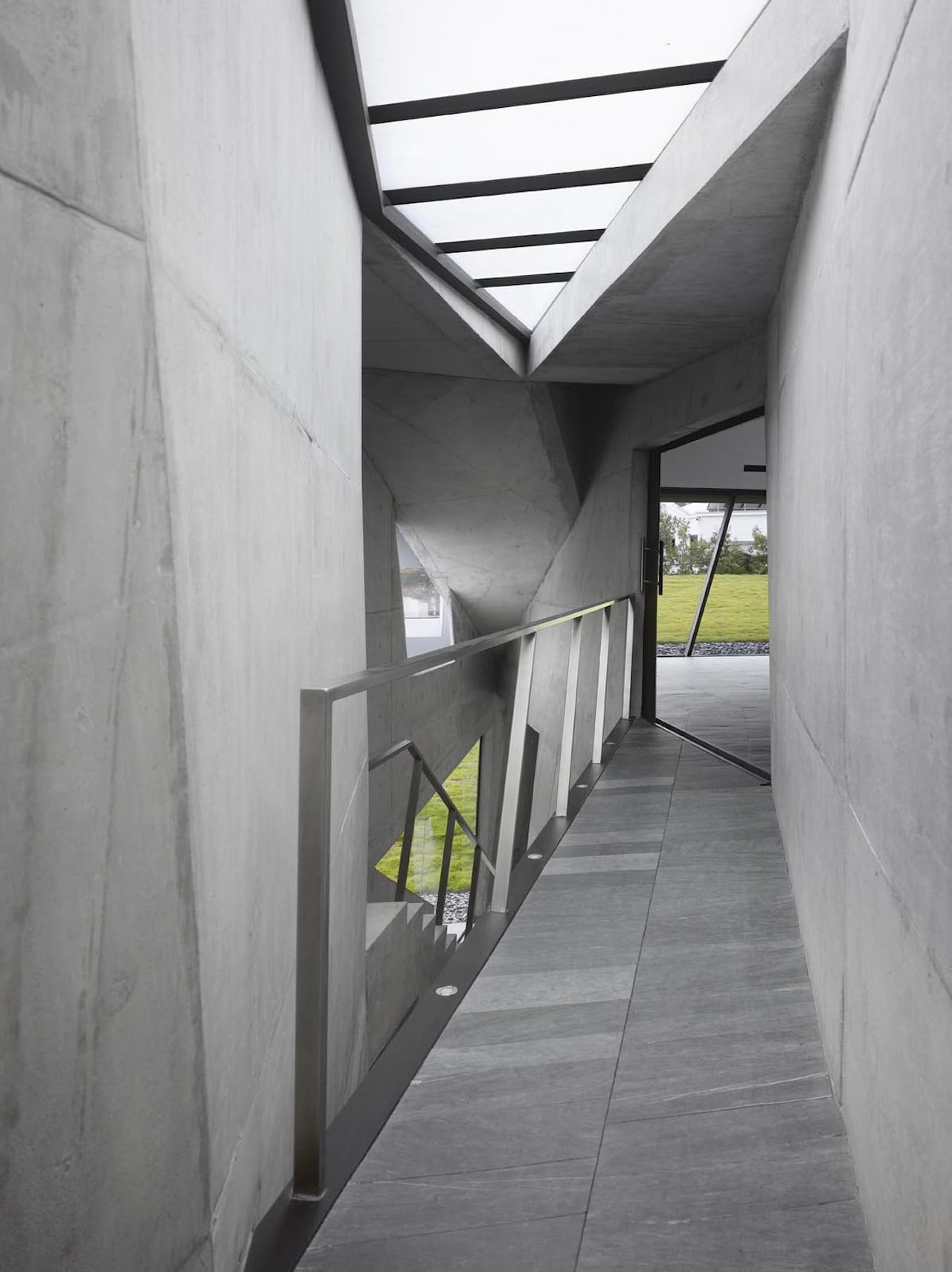 Featuring heavy use of steel, glass, and concrete the Ecoscopic House combines these three different materials to output a holistic kind of architecture. As a result, however, the spacious 7,000-square-foot interior barely has anything, setting off the entire house’s minimalist vibe. However, the devil’s in the details, of course — like a huge potted plant inside the shower, the asymmetrical skylight spilling sun into the living room. Or even the slanted grass wall that makes the lower level look like a hangar.