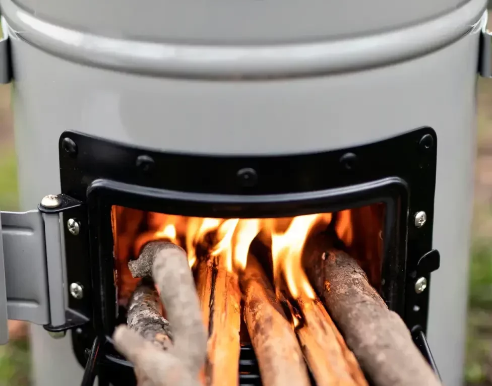 It uses dual chambers to ensure safe cooking and durability. The fully insulated vertical combustion chamber forces gases to mix with the flames, thus decreasing harmful emissions while boasting fuel efficiency. Meanwhile, the top door chamber, which is lined with refractory metal, provides ultimate durability. Both the main combustion chamber door and the damper door come reinforced with metal frames with hinges to securely close the doors for airflow regulation.