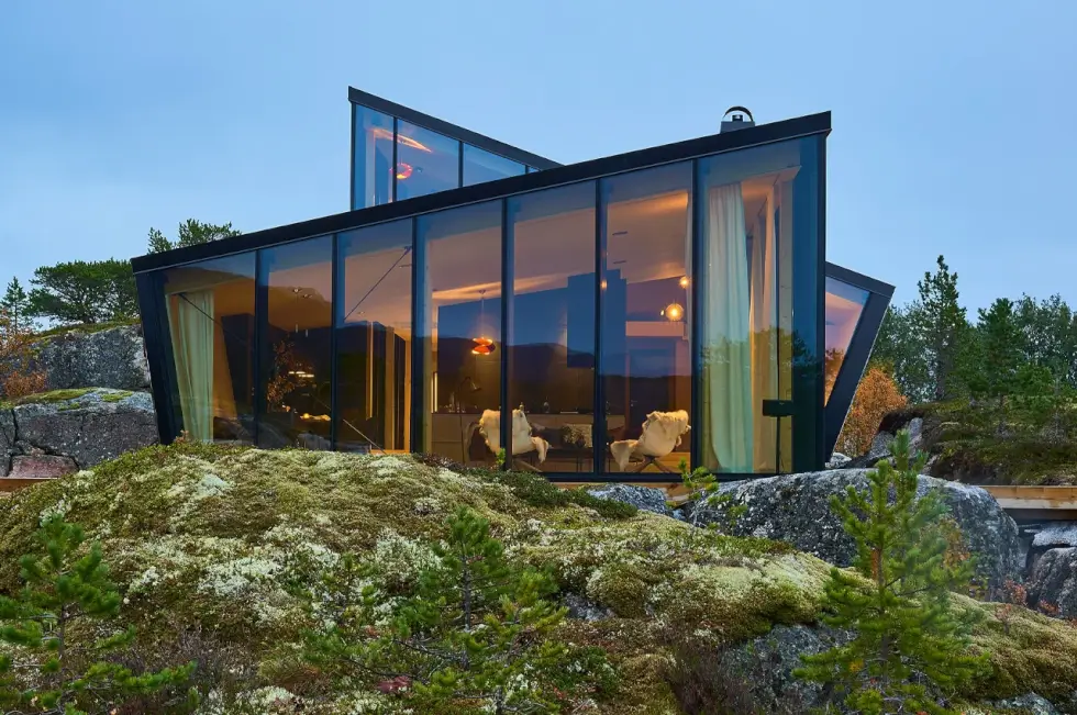 Nsorway-based Stinessen Arkitektur designed the Efjord Cabin with triple glazing for unobstructed views of its scenic topography. Located on the Hallvardøy Island in northern Norway, the property sits on a sloped hill with a layout that opens and closes in different directions.