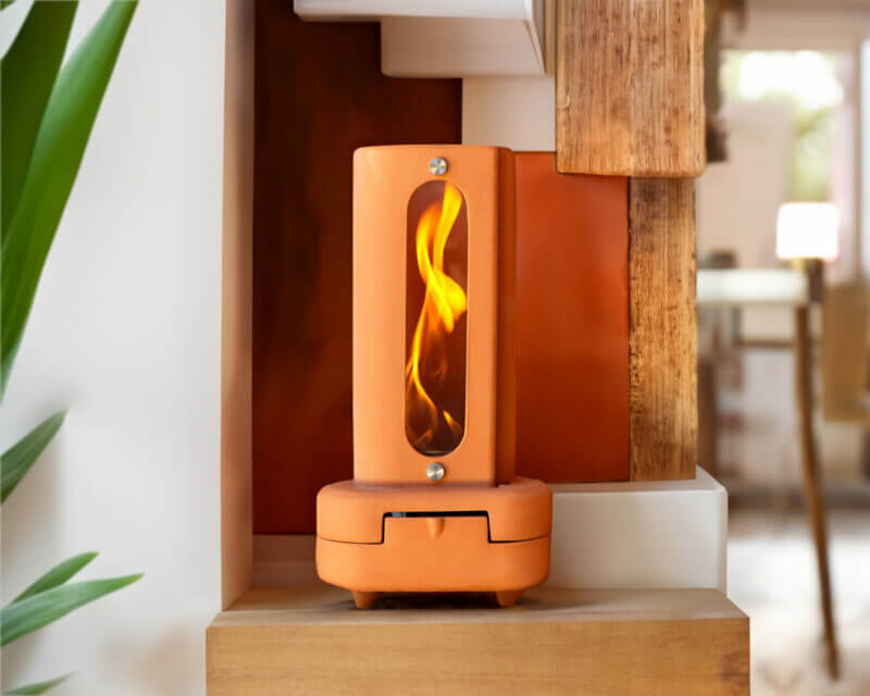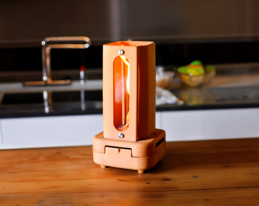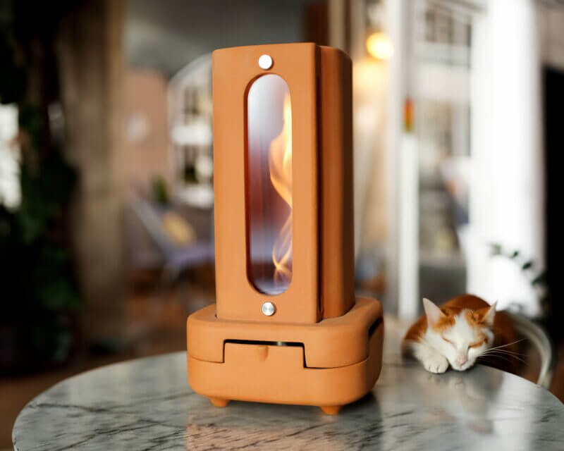 It is crafted out of Terra de Flamma — a special type of terracotta which uniformly absorbs and distributes heat. Special cutouts and geometry of the Tornado produce a chimney-like effect and also add the spinning effect to the flame. For safety, a heat-resistant glass window provides a clear view of the dancing display of combustion within.