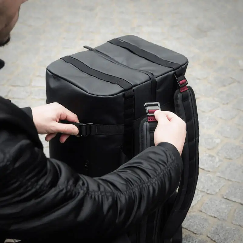 Ekster’s Grid Duffel Backpack offers 43L of storage and opens up clamshell style. Its suitcase-like design reveals a zipped dual interior featuring a quick-access padded compartment for a 13″ laptop and two zipped pockets. It also has elastic mesh pockets to store various small items like a power bank, sunglasses, and other tech devices, while a top zipper offers quick access to the laptop.