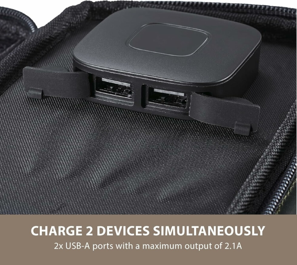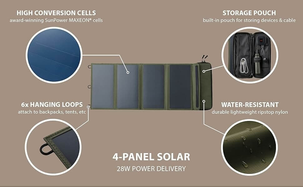 ELECOM’s NESTOUT Solar Panel features a four-panel solar that outputs 28W PD. It can charge two devices simultaneously with its built-in USB-A ports. It is compatible with Apple or Android devices, and more.  There’s also a built-in current checker display so you can monitor the solar power generated into the ports.