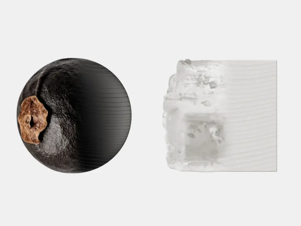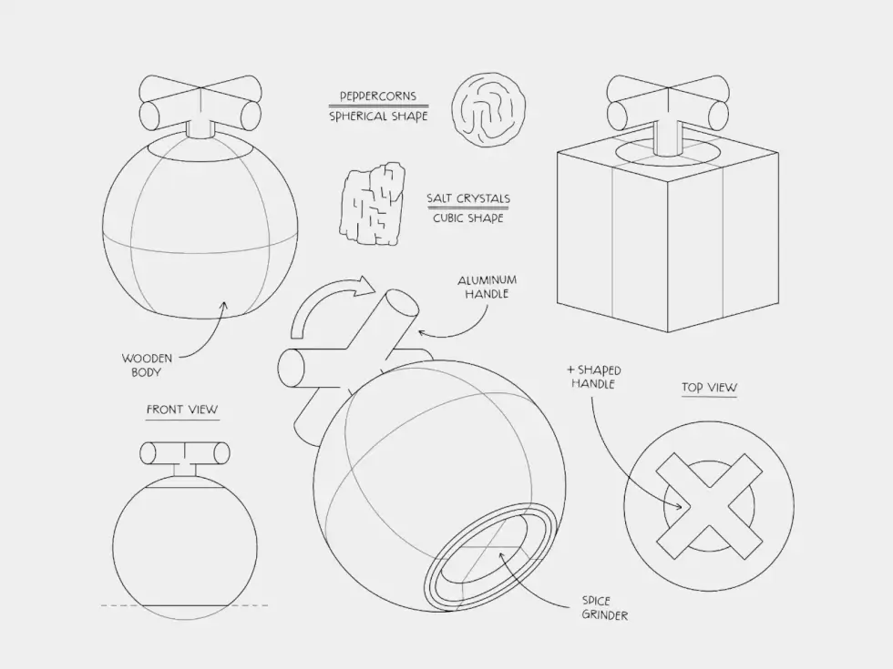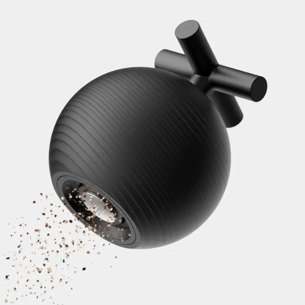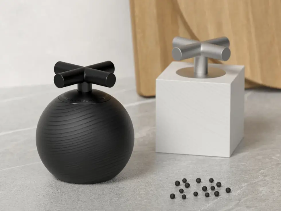 The ELEMENTS pepper mill is black and spherical, mimicking the color and shape of whole peppercorns before they are crushed and grinded. Meanwhile, the salt grinder is a pristine white cube that mirrors the crystalline form of salt itself.