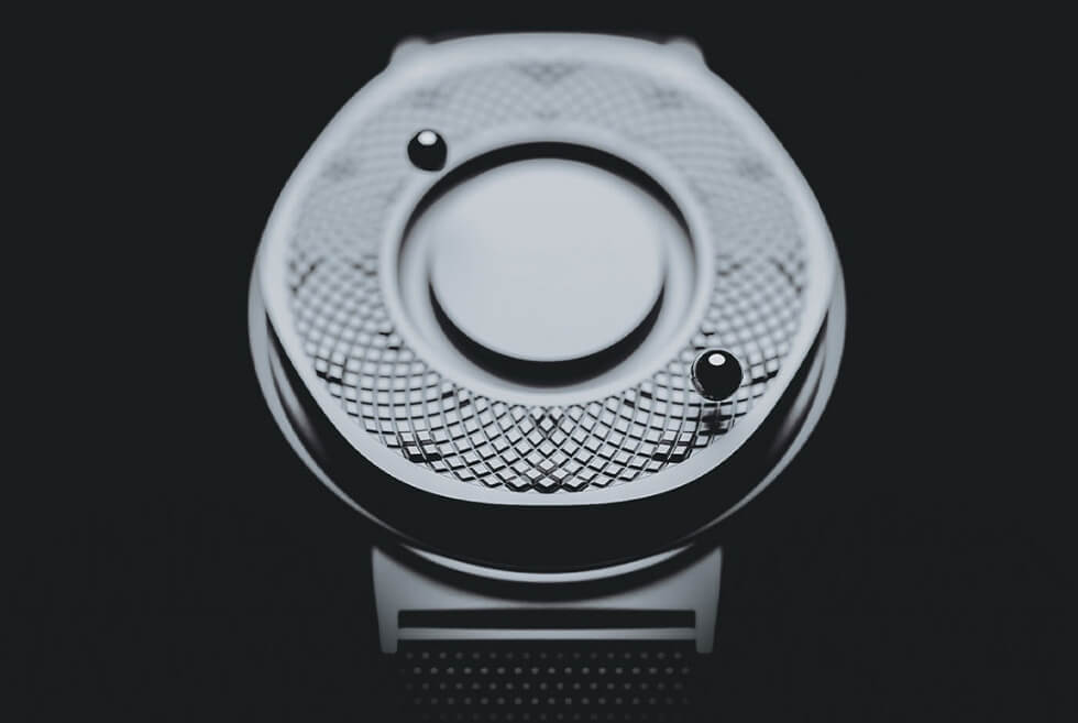 Instead, there are two ball bearings that travel along a track with the help of magnets. The inner one represents the minutes, while the outer indicates the hours. Raised textures on the dial ring replace the indices. Meanwhile, it runs on a Ronda quartz movement.