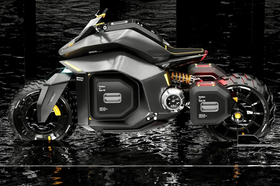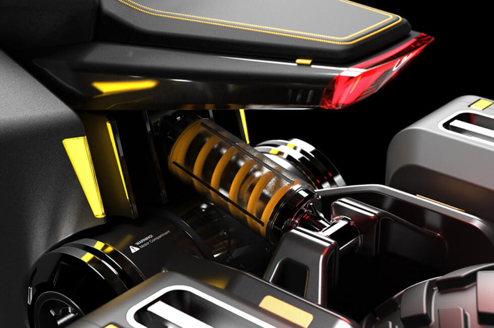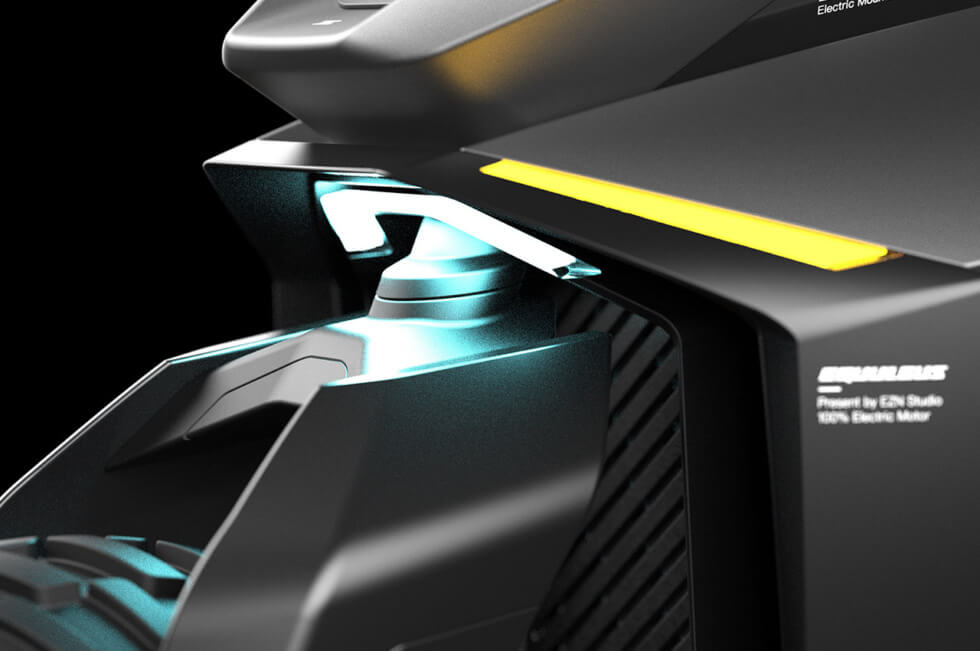 Ethan Hsu gives the green moto a sleek futuristic form factor with aggressive aerodynamics. It almost looks like a sports bike, but it serves a different specific purpose. Since there is no engine to speak of, the space holds storage modules instead. In total, the EQUULEUS can accommodate up to five and these are in strategic arrangements to not compromise stability.
