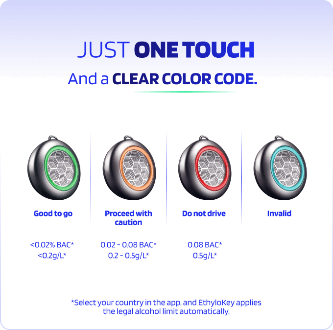 Then in a few seconds, EthyloKey immediately displays a clear, color-coded result after the test. Green for Good to “Go,” orange for “Proceed with Caution,” red warns not to drive, and blue is for invalid tests.