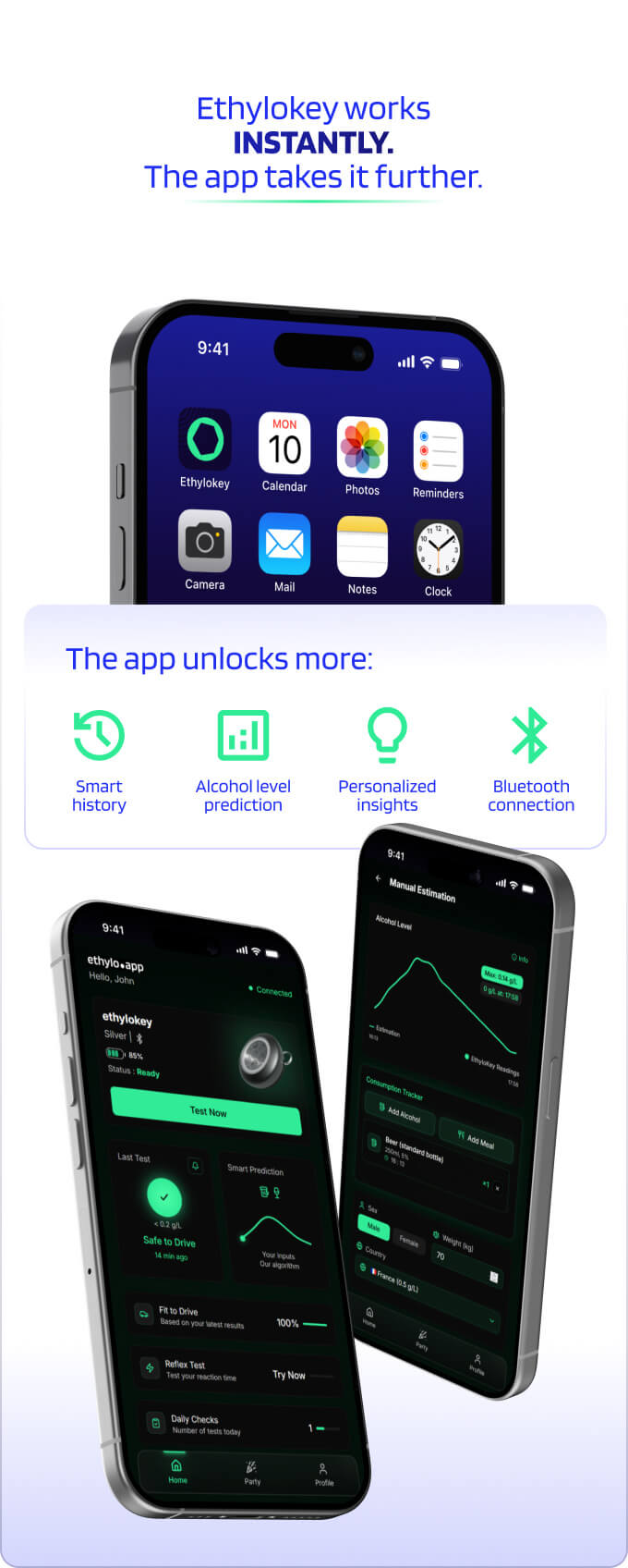 But with the EthyloKey, you test first before you drive. It’s a circular, compact device that serves as your personal alcohol tester. It checks for microscopic alcohol-related vapors naturally emitted through your skin. With a simple touch, it analyzes and determines your level of alcohol intoxication.