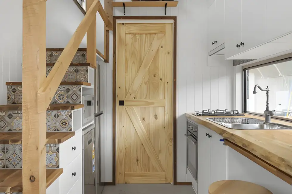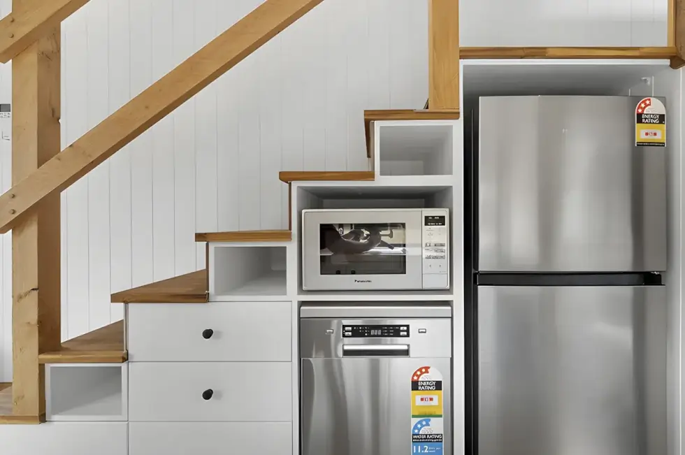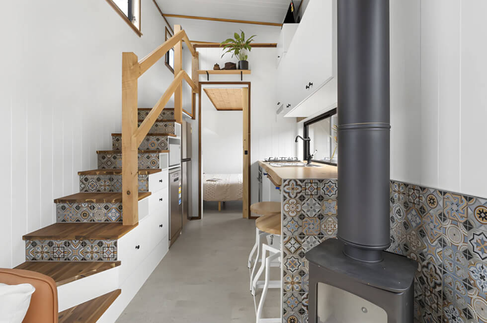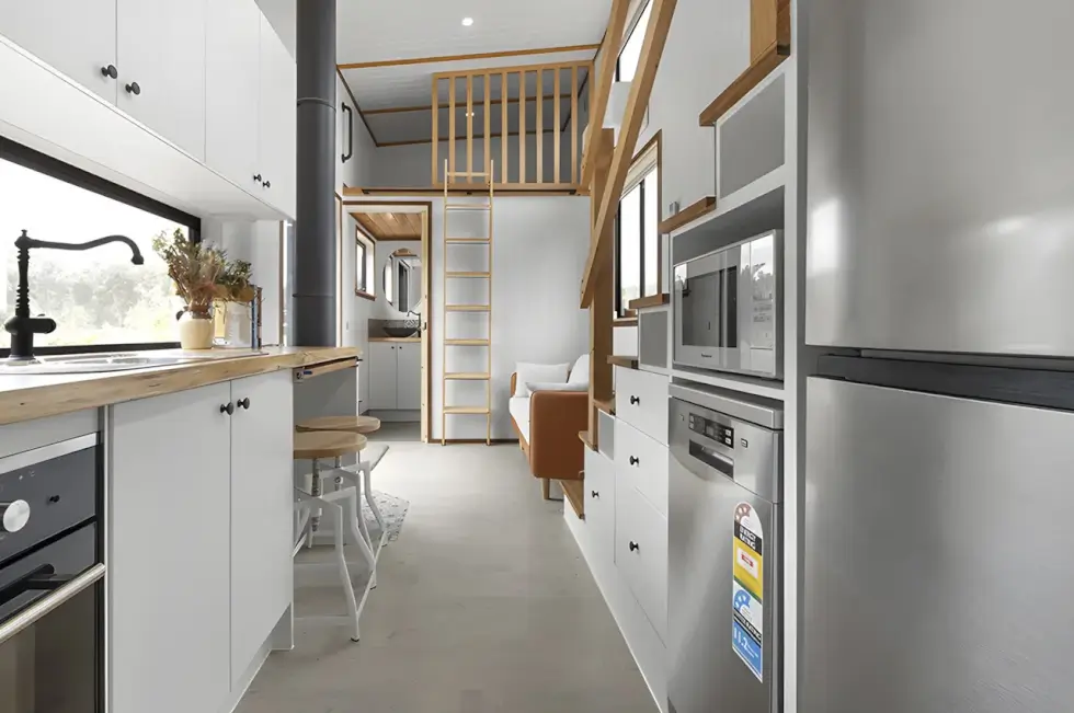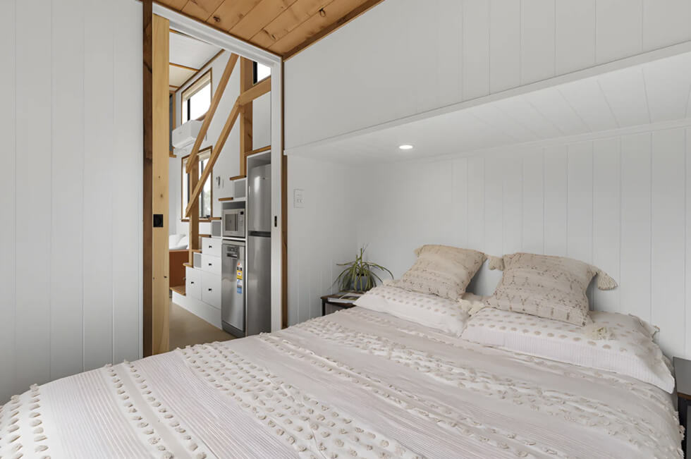 The Grevillea is well-equipped to make tiny house living comfortable. There’s a small sofa for relaxing, a sink, and a well-equipped kitchen with overhead cupboards and cabinets for storage. The kitchen, which is located next to the master bedroom, comes with a two-burner propane-powered stove, dishwasher, fridge/freezer, microwave, and a full-size electric oven. It also includes a pull-out table area and a breakfast bar for two.
