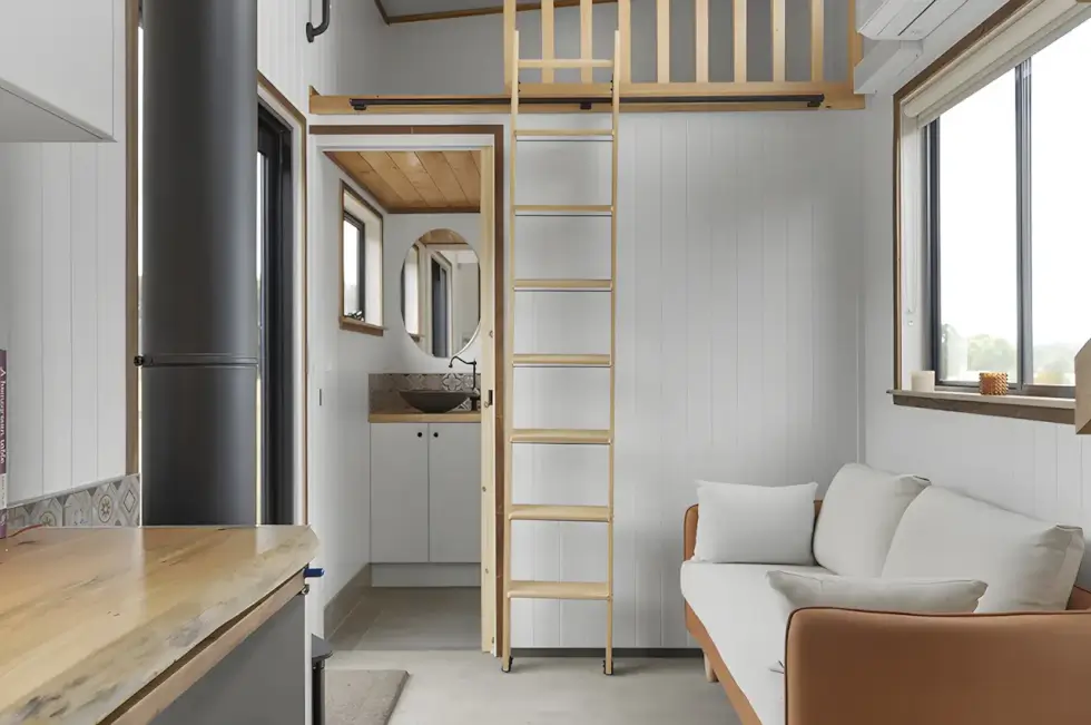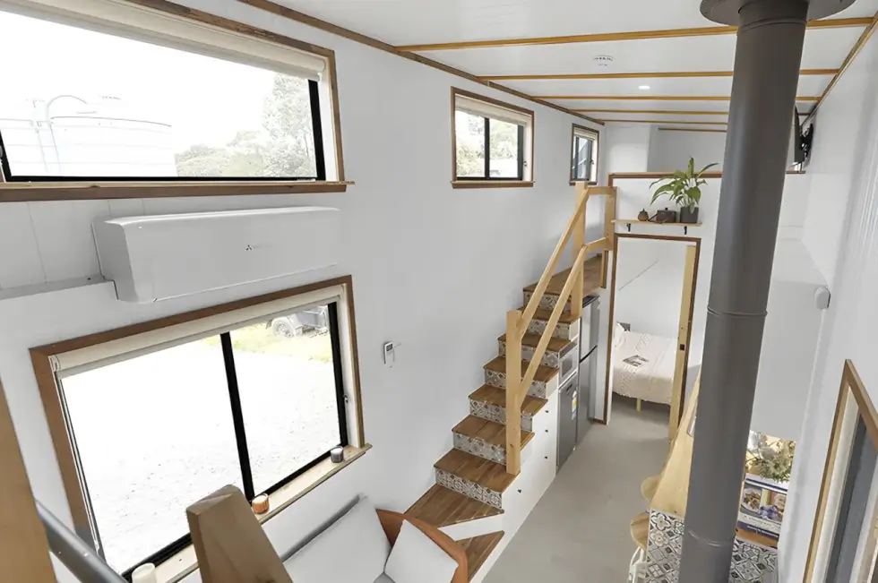 The home boasts a smart space-saving layout with the first floor space divided into the kitchen/dining, living room, bedroom, and bathroom. Both the downstairs and upstairs bedroom have queen sized beds, which can sleep two each (four adults total). A wooden storage-integrated staircase leads to the second floor while a ladder to the loft bedroom.
