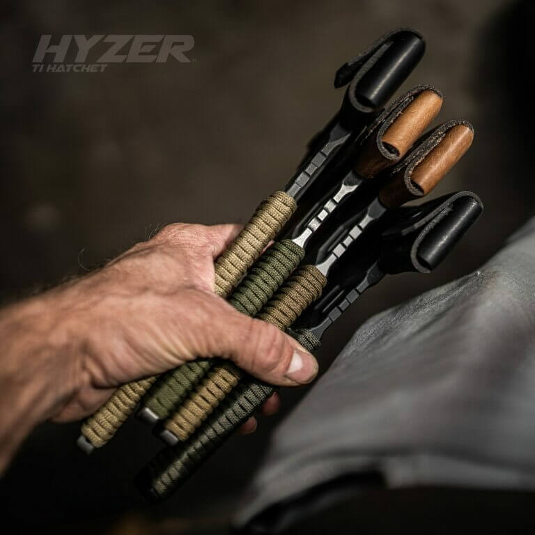 What sets the HYZER Titanium Hatchet apart from any of its kind in the market is its modular design. It features an indefinitely customizable nested head system which holds the head portion with greater redundancy. The head is replaceable with options to choose between multiple D2 steel head weight.