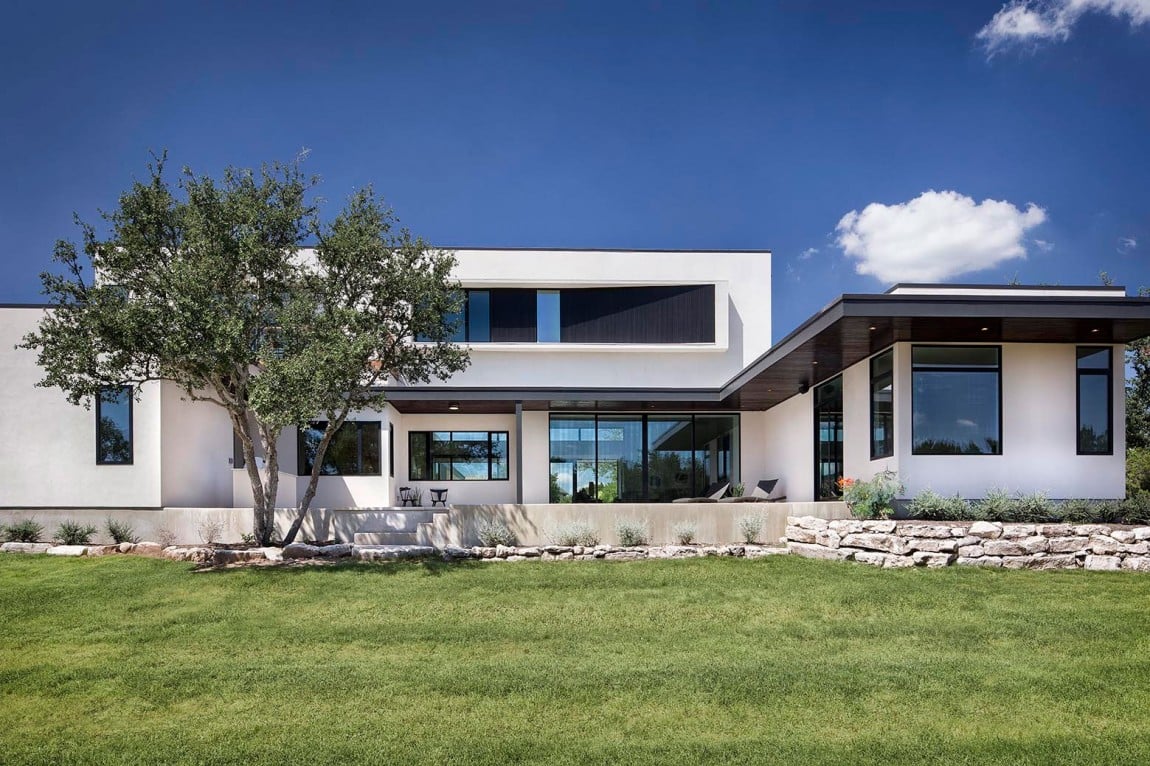 Completed in 2015 following a design by Clark Richardson Architects, the stunning Lakeway Residence is a 4,370 square foot luxury home located in Austin, Texas. The building sits on a hill, which gives it stunning distant views over green treetops. Its outdoor spaces are extra inviting thanks to the large double courtyard with manicured lawns on either sides of the driveway.