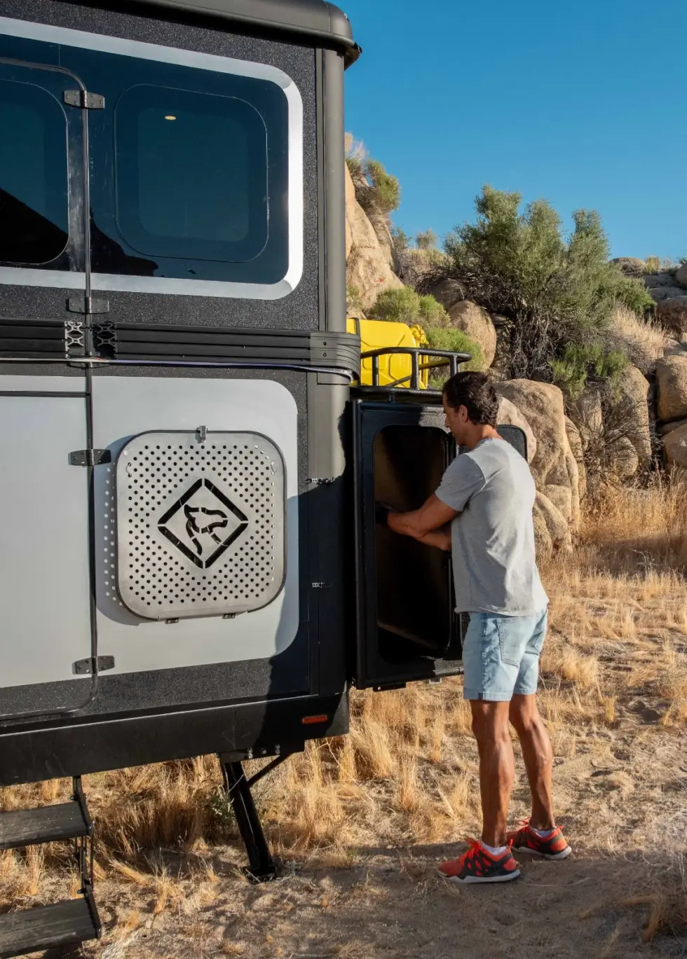 Food preparation inside the RV is convenient courtesy of the sink/stove combo, microwave, double drawer refrigerator/freezer, and kitchen storage. Should you choose to take things outside, the CAPAX is equipped with a comprehensive outdoor base camp kitchen. Owners have access to a three-burner stove, kitchen sink, folding countertop, and more.