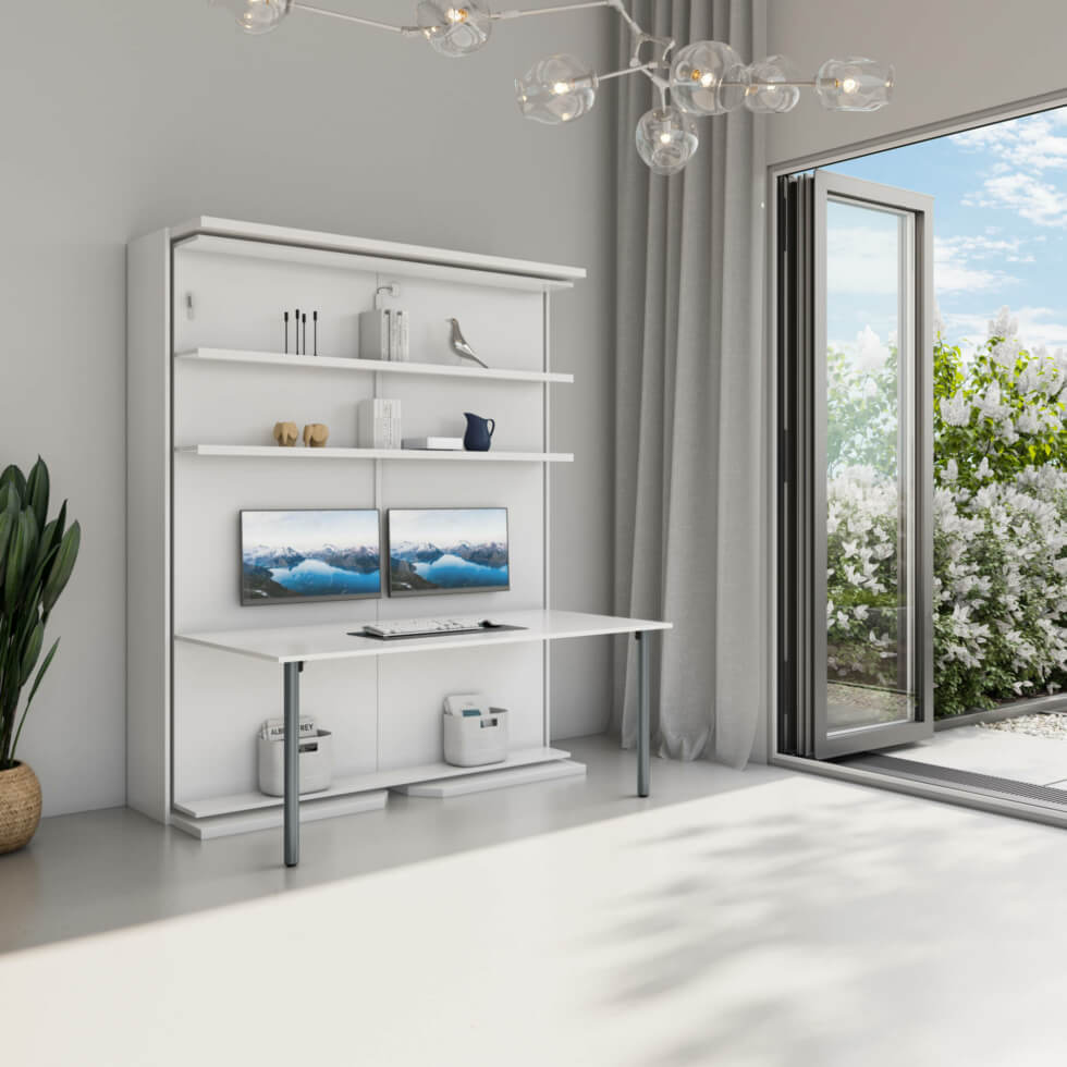 The Compatto Rotating Office Murphy Bed with Desk by Expand Furniture “redefines your office with multi-functional elegance.” It offers a solution for those with limited interior space to fit both a bedroom and an office area as it serves both in a modular design.