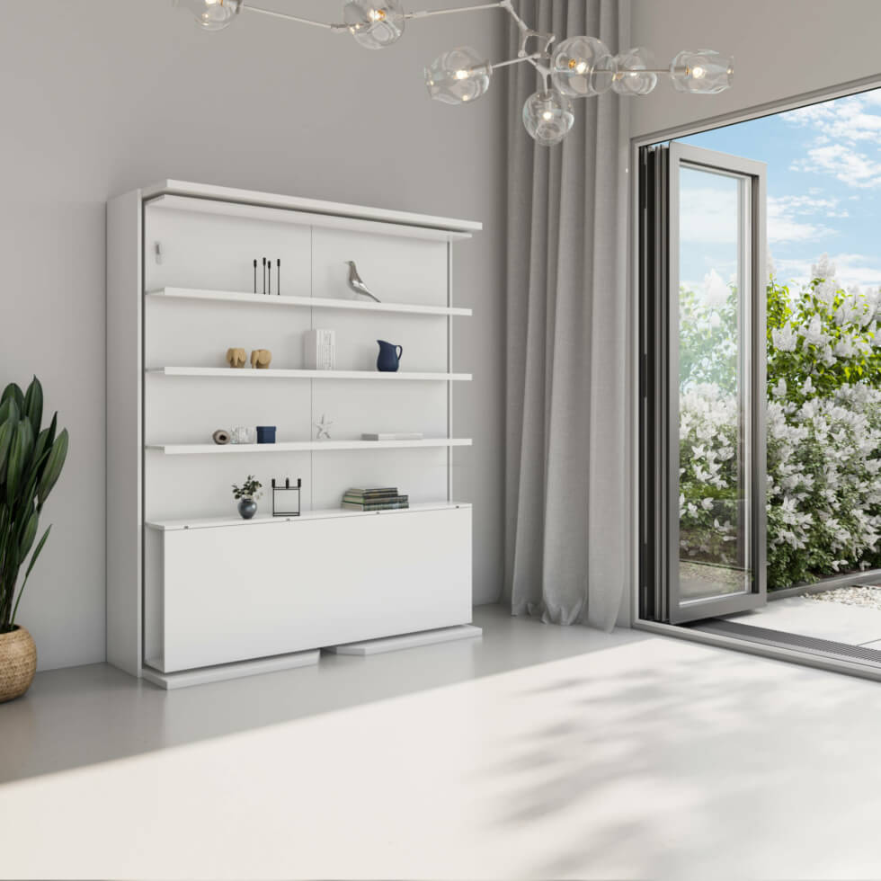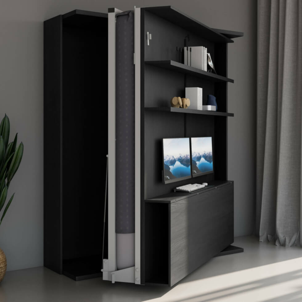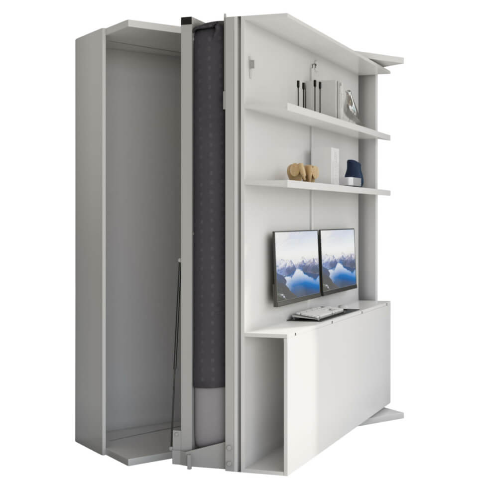 Its name is very self-explanatory as it revolves to reveal a Murphy bed on one size with a queen-size Italian Oeko-Tex memory foam mattress and a horizontal folding office table on the other side with a few shelving to display items or mount dual monitors, small format computers or all in one iMacs.
