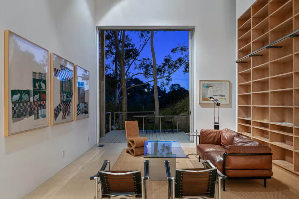 The Experimental House has two bedrooms and two baths, a massive two-story living room, and an open loft. The property also has a large studio with a separate entrance. It boasts an open floor layout that connects the living area to the kitchen and dining space. The built-in bookshelf with a rolling library ladder adorns one side of the wall in the living space.