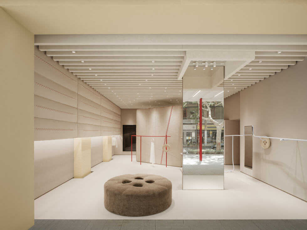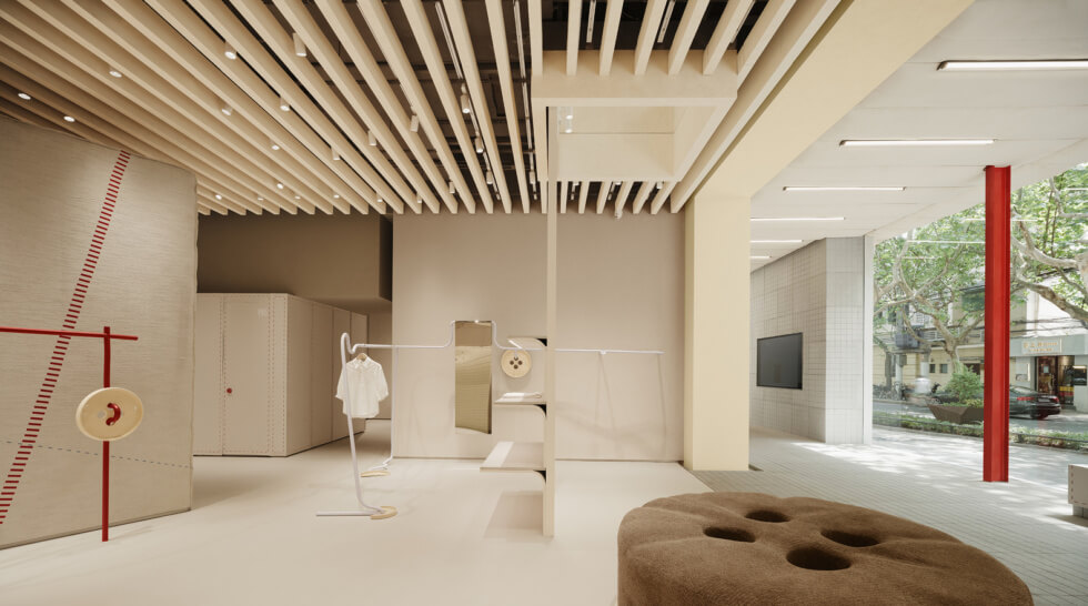 F.O.G Architecture adapts Bernard Tschumi’s ‘event space’ theory in the mid-70s to bring new life to the interiors of the upscale fashion brand Xiaozhuo at 758 Julu Road in Shanghai, China. The boutique features sculptural buttons and vibrant stitching details while incorporating the brand’s distinctive red, yellow, purple, and blue colors.